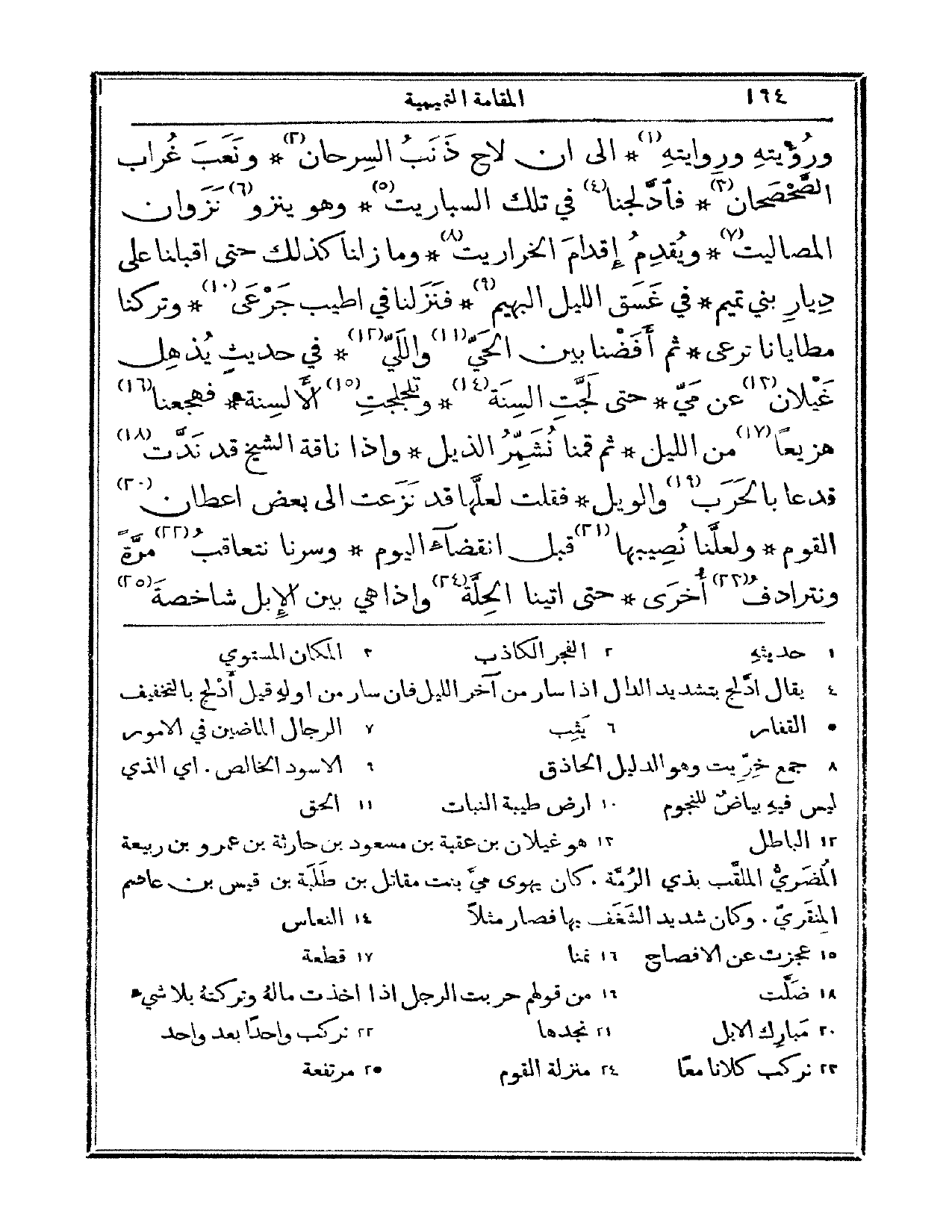ورؤيته وروايته. إلى أن لاح ذنب الشرحان، ونعب غراب الصحصحان. فادلجنا في تلك السباريت، وهو ينزو نزوان المصاليت ويقدم إقدام الخراريت. وما زلنا كذلك حتى أقبلنا على ديار بني تميم، في غسق الليل البهيم. فنزلنا في أطيب خرعى، وتركنا مطايانا ترعى. ثم أفضنا بين الحي واللي، في حديث يذهل غيلان عن مي. حتى لجت السنة وتلجلجت الألسنة. فهجعنا هزيعاً من الليل ثم قمنا نشمر الذيل، وإذا ناقة الشيخ قد ندت فدعا بالحرب والويل. فقلت لعلها قد نزعت إلى بعض أعطان القوم، ولعلنا نصيبها قبل انقضاء اليوم. وسرنا نتعاقب مرة ونترادف أخرى. حتى أتينا الحلة وإذا هي بين الإبل شاخصة