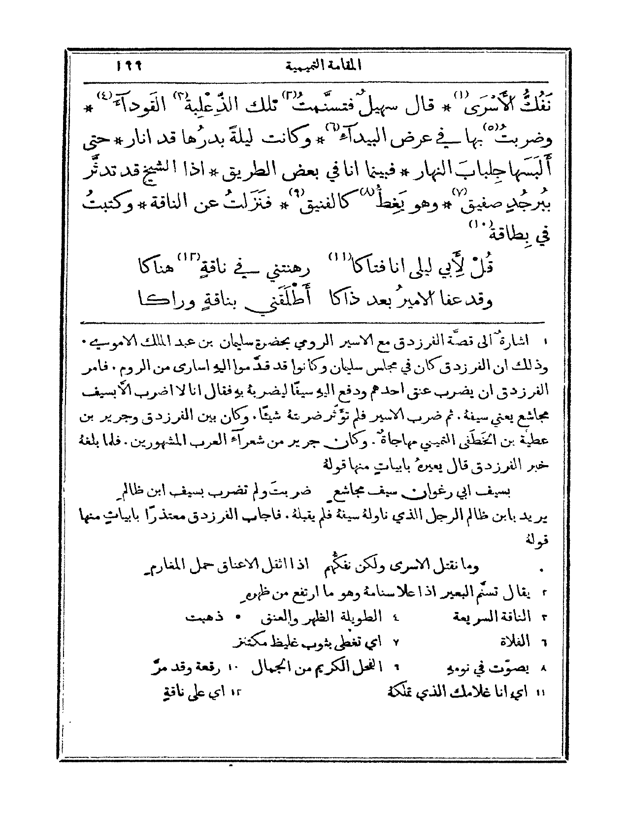 نفك الأسرى. قال سهيلٌ: فتسنمت تلك الذعلبة القواداء، وضربت بها في عرض البيداء. وكانت ليلة بدرها قد أنار حتى ألبسها جلباب النهار. فبينما أنا في بعض الطريق، إذا الشيخ قد تدثر ببرجد صفيق وهو يغط كالفنيق. فنزلت عن الناقة، وكتبت في بطاقة: