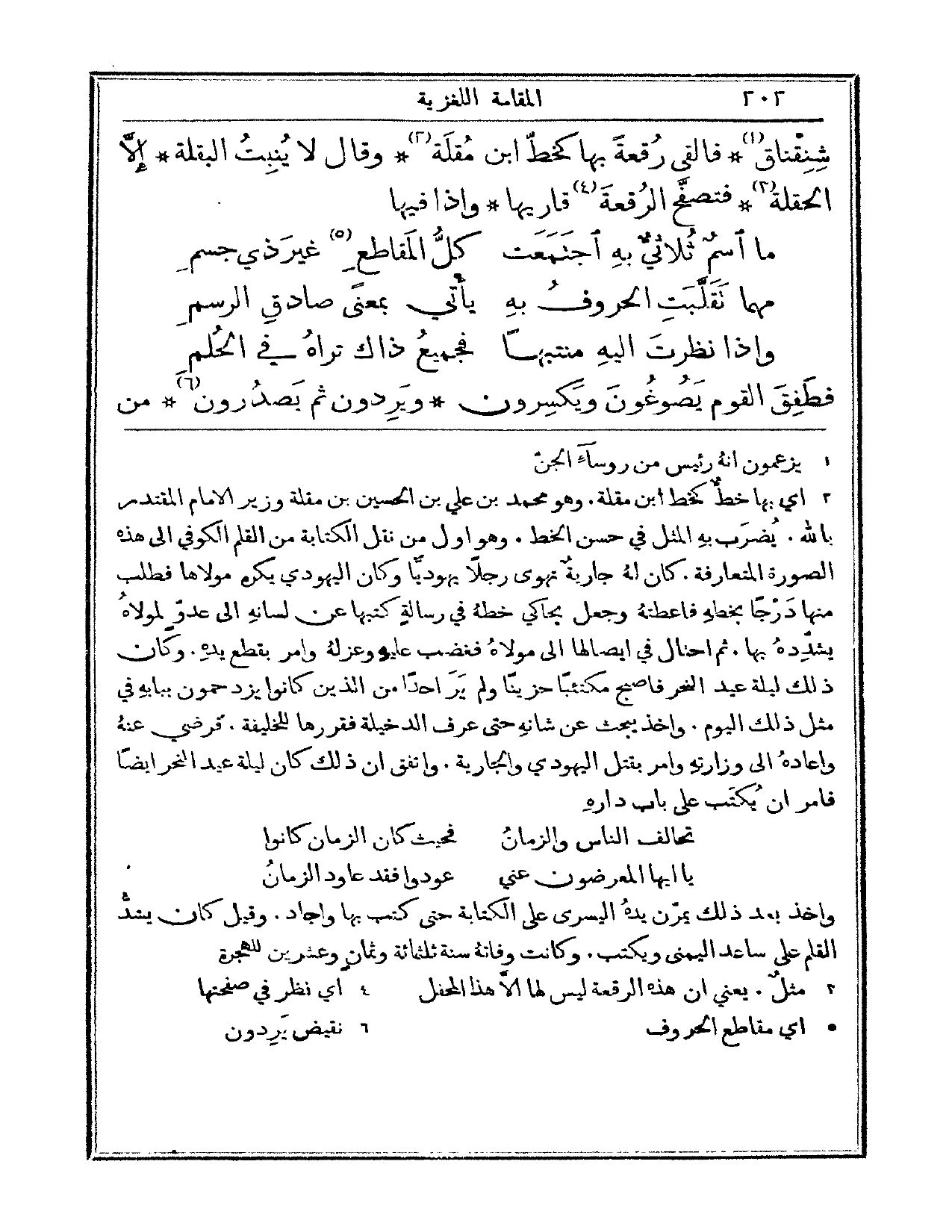 شنقناق. فألقى رقعة بها كخط ابن مقلة وقال: لا ينبت البقلة، إلا الحقلة. فتصفح الرقعة قاريها، وإذا فيها: