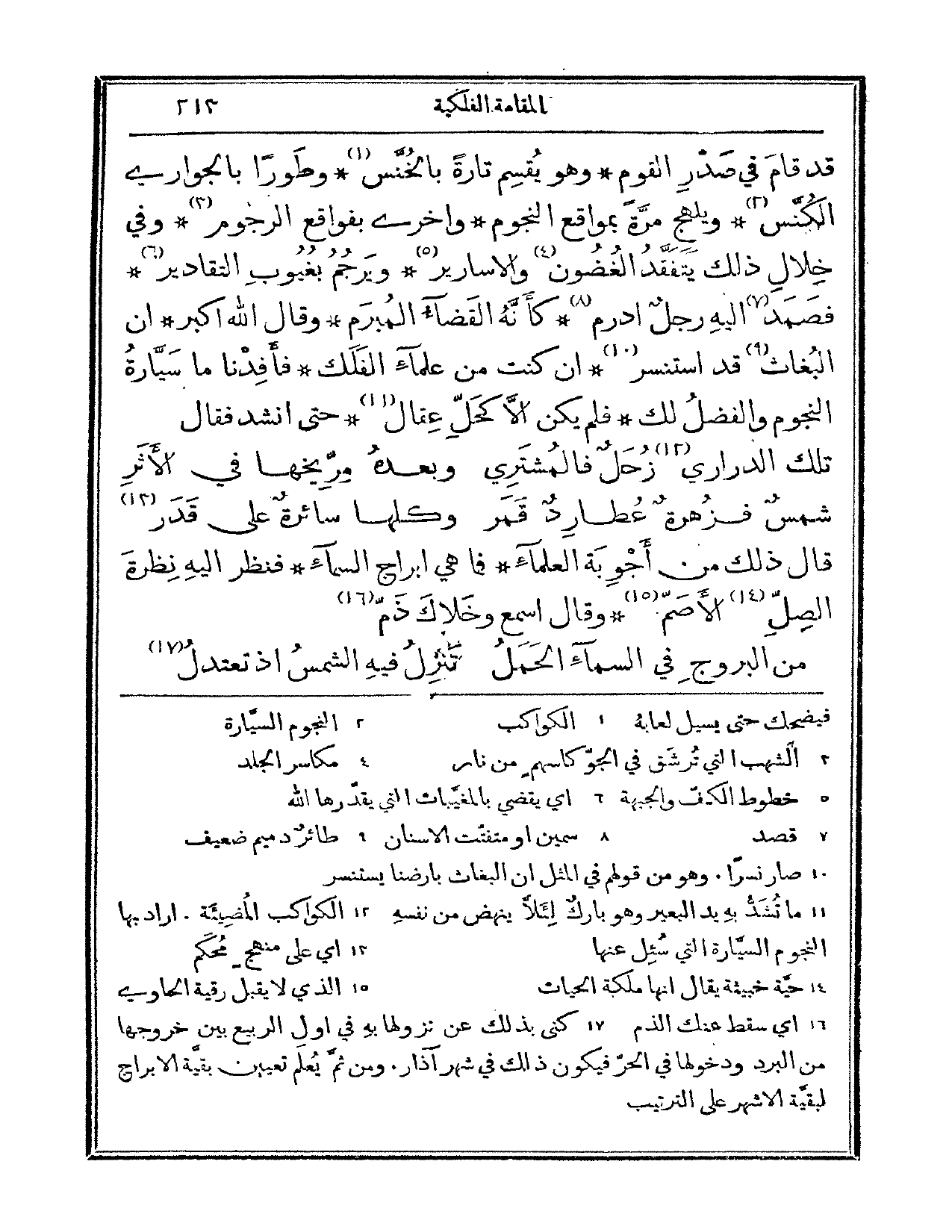 قد قام في صدر القوم. وهو يقسم تارة بالخنس، وطوراً بالجواري الكنس. ويلهج مرةً بمواقع النجوم وأخرى بفواقع الرجوم. وفي خلال ذلك يتفقد الغضون والأسارير، ويرجم بغيوب التقادير. فصمد إله رجلٌ أدرم كأنه القضاء المبرم. وقال: الله أكبر، إن البغاث قد استنسر. إن كنت من علماء الفلك، فأفدنا ما سيارة النجوم والفضل لك. فلم يكن إلا كحل عقال، حتى أنشد فقال: