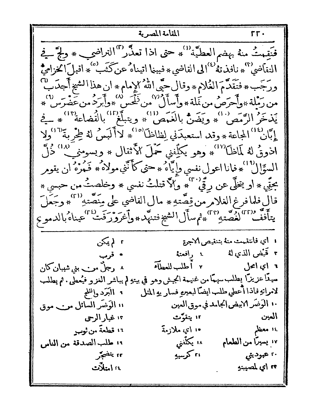 فنقمت منه بهذم العطية. حتى إذا تعذر التراضي ولج في التقاضي، نافذته إلى القاضي. فبينما أتيناه عن كثب، أقبل الخزامي ورجب. فتقدم الغلام، وقال: حيا الله الإمام إن هذا الشيخ أجدب من رحلة وأحرص من نملة. وأسأل من فلحس وأبرد من عضرس. يذخر المرمض ويضن بالغمص. ويتبلغ بالقضاعة في إبان المجاعة. وقد استعبدني لظاظاً، لا ألبس له طحربةً ولا أذوق له لماظاً. وهو يكلفني حمل الأثقال ويسومني ذل السؤال. فأنا أعول نفسي وإياه، حتى كأنني مولاه. فمره أن يقوم بحقي أو يتخلى عن رقي. وإلا قتلت نفسي وخلصت من حبسي. قال: فلما فرغ الغلام من قصته، مال القاضي على منصته، وجعل يتأفف لغصته. ثم سأل الشيخ فتنهد، واغرورقت عيناه بالدموع