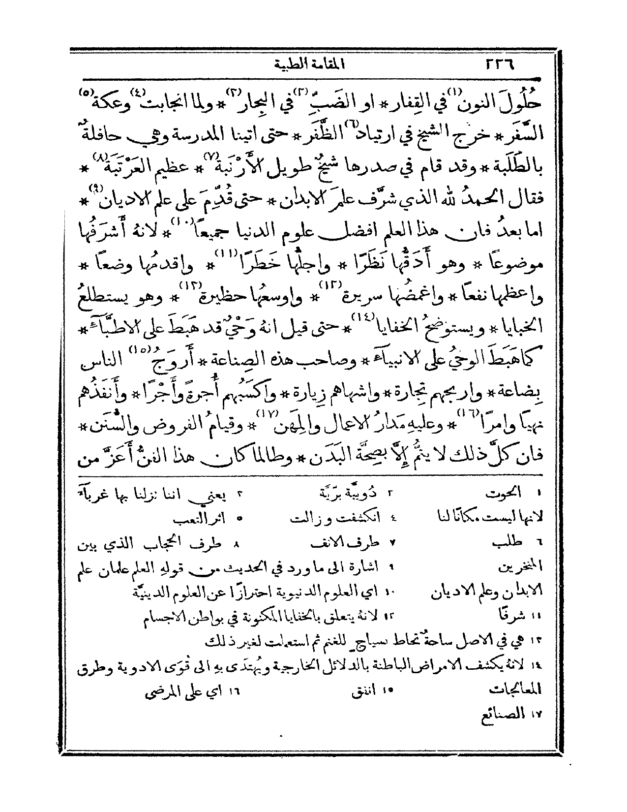 حلول النون في القفار أو الضب في البحار. ولما انجابت وعكة السفر، خرج الشيخ في ارتياد الظفر. حتى أتينا المدرسة وهي حافلةٌ بالطلبة، وقد قام في صدرها شيخٌ طويل الأرنبة، عظيم العرتبة. فقال الحمد لله الذي شرف علم الأبدان، حتى قدم على علم الأديان، أما بعد فإن هذا العلم أفضل علوم الدنيا جميعاً، لأنه أشرفها موضوعاً. وهو أدقها نظراً، وأجلها خطراً، وأقدمها وضعاً، وأعظمها نفعاً. وأغمضها سريرة، وأوسعها حظيرة. وهو يستطلع الخبايا ويستوضح الخفايا. حتى قيل: إنه وحيٌ قد هبط على الأطباء، كما هبط الوحي على الأنبياء. وصاحب هذه الصناعة، أروج الناس بضاعة. وأربحهم تجارة وأشهاهم زيارة. وأكسبهم أجرةً، وأجراً وأنفذهم نهياً وأمراً. وعليه مدار الأعمال والمهن، وقيام الفروض والسنن، فإن كل ذلك لا يتم إلا بصحة البدن. وطالما كان هذا الفن أعز من