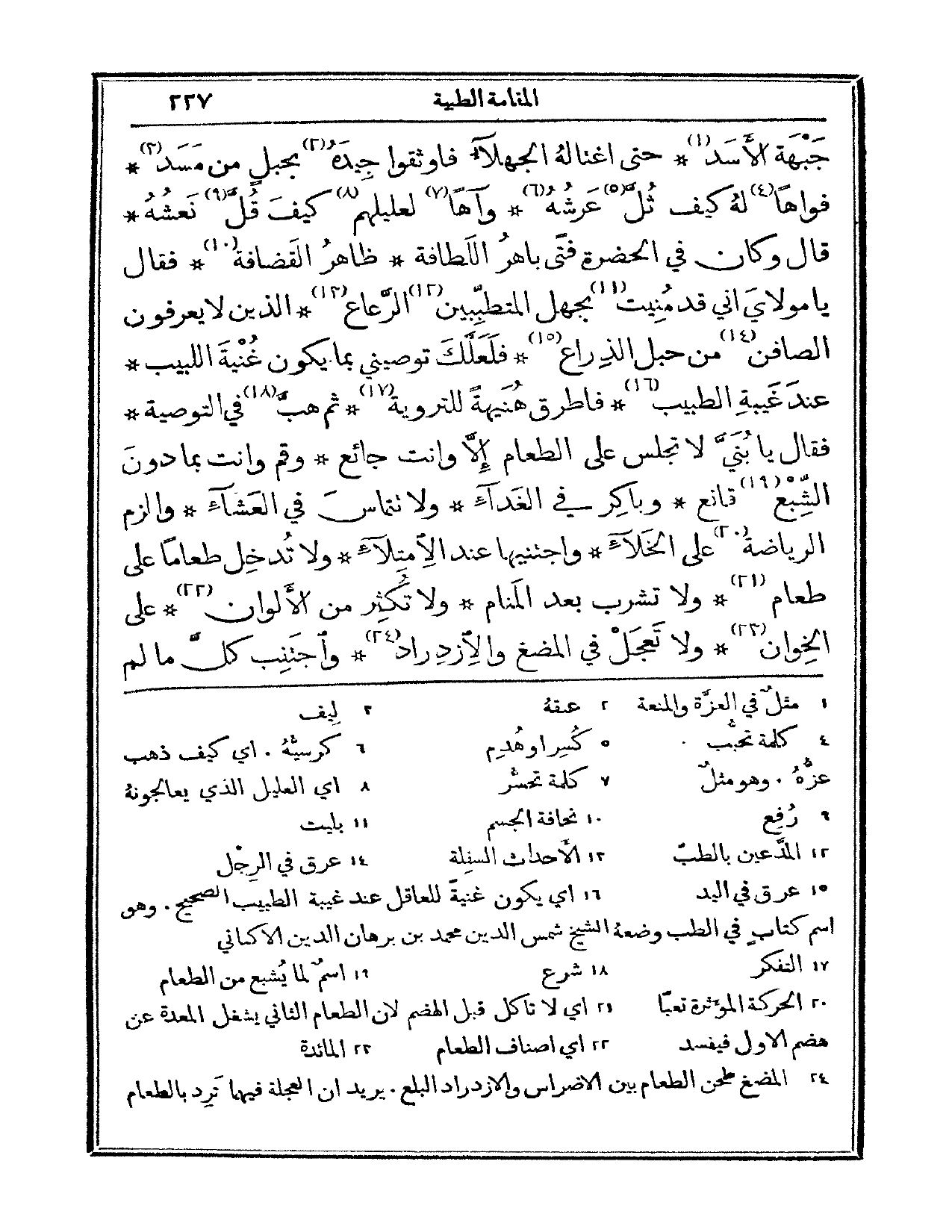 جبهة الأسد، حتى اغتالته الجهلاء فأوثقوا جيده بحبل مسد. فواهاً له كيف ثل عرشه وآهاً لعليلهم كيف قل نعشه قال: وكان في الحضرة فتى باهر اللطافة، ظاهر القضافة. فقال: يا مولاي إني قد منيت بجهل المتطببين الرعاع، الذين لا يعرفون الصافن من حبل الذراع. فلعلك توصيني بما يكون غنية اللبيب، عند غيبة الطبيب. فاطرق هنيهةً للتروية، ثم هب في التوصية، فقال: يا بني لا تجلس على الطعام إلا وأنت جائع، وقم وأنت بما دون الشبع قانع. وباكر في الغداء، ولا تتماس في العشاء، والزم الرياضة في الخلاء، واجتنبها عند الامتلاء. ولا تدخل طعاماً على طعام، ولا تشرب بعد المنام. ولا تكثر من الألوان، على الخوان. ولإتعجل في المضغ والازدراد، واجتنب كل ما لم