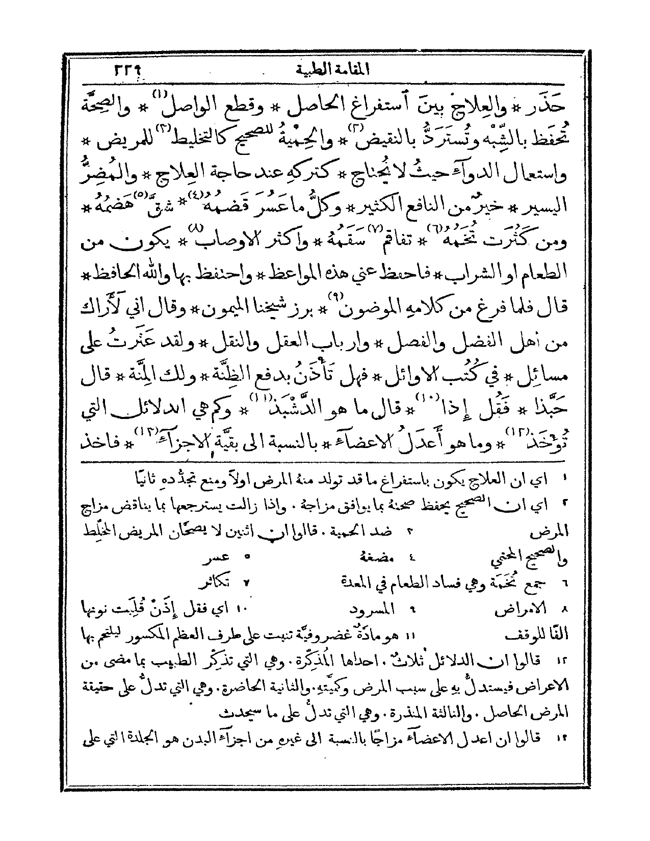 حذر، والعلاج بين استفراغ الحاصل، وقطع الواصل. والصحة تحفظ بالشبه وتسترد بالنقيض، والحمية للصحيح كالتخليط للمريض. واستعمال الدواء حيث لا يحتاج، كتركه عند حاجة العلاج. والمضر اليسير، خير من النافع الكثير، وكل ما عسر قضمه، شق هضمه. ومن كثرت تخمه، تفاقم سقمه. وأكثر الأوصاب، يكون من الطعام أو الشراب. فاحفظ عني هذه المواعظ، واحتفظ بها والله الحافظ. قال: فلما فرغ من كلامه الموضون، برز شيخنا الميمون. وقال: إ، ي لأراك من أهل الفضل والفصل، وأرباب العقل والنقل. ولقد عثرت على مسائل، في كتب الأوائل. فهل تأذن بدفع الظنة، ولك المنة؟ قال: حبذا فقل إذا. قال: ما هو الدشبذ؟ وكم هي الدلائل التي تؤخذ؟ وما هو أعدل الأعضاء، بالنسبة إلى بقية الأجزاء؟ فأخذ