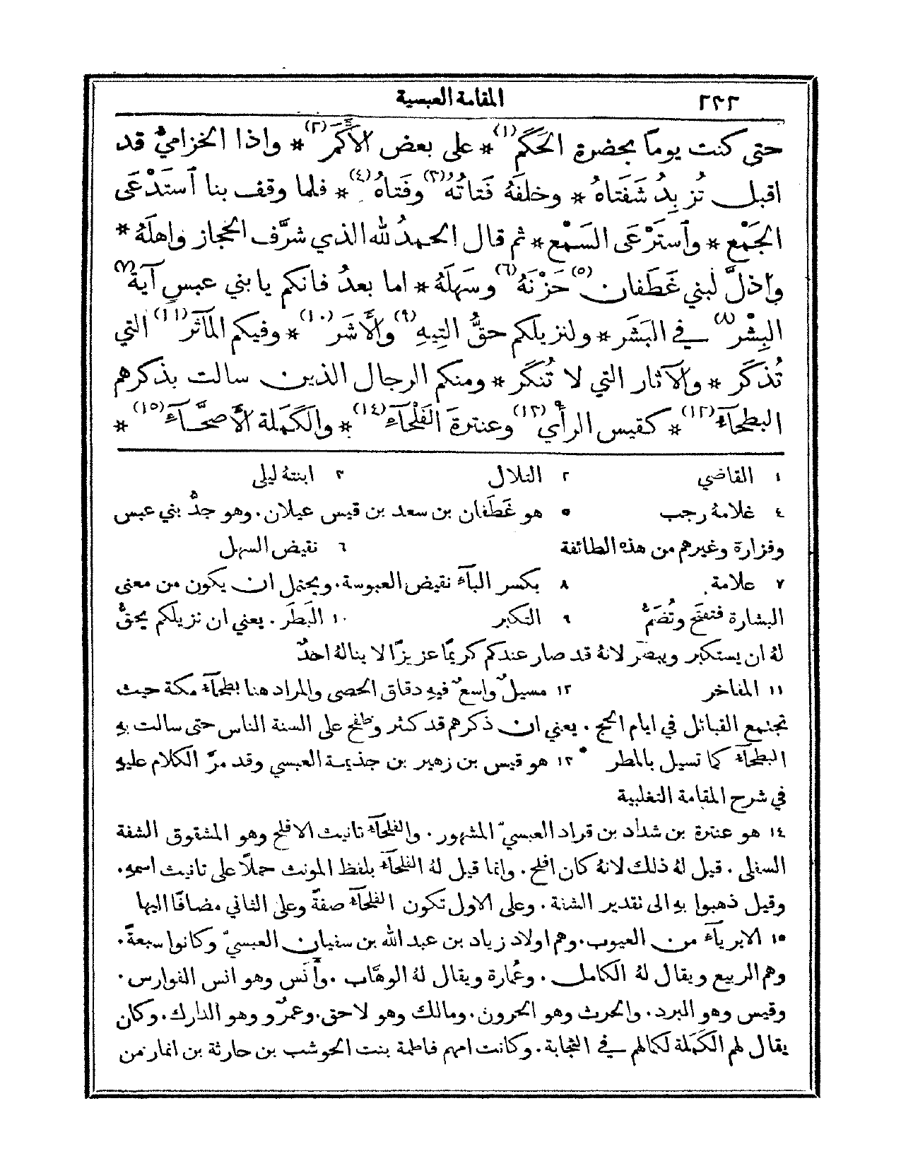 حتى كنت يوماً بحضرة الحكم، على بعض الأكم. وإذا الخزامي قد أقبل تزبد شفتاه، وخلفه فتاته وفتاه. فلما وقف بنا استدعى الجمع واسترعى السمع. ثم قال: الحمد الله الذي شرف الحجاز وأهله، وأذل لبني غطفان حزنه وسهله. أما بعد فإنكم يا بني عبس آية البشر في البشر ولنزيلكم حق التيه والأشر. وفيكم المآثر التي تذكر، والآثار التي لا تنكر. ومنكم الرجال الذين سالت بذكرهم البطحاء كقيس الرأي وعنترة الفلحاء والكملة الأصحاء.
