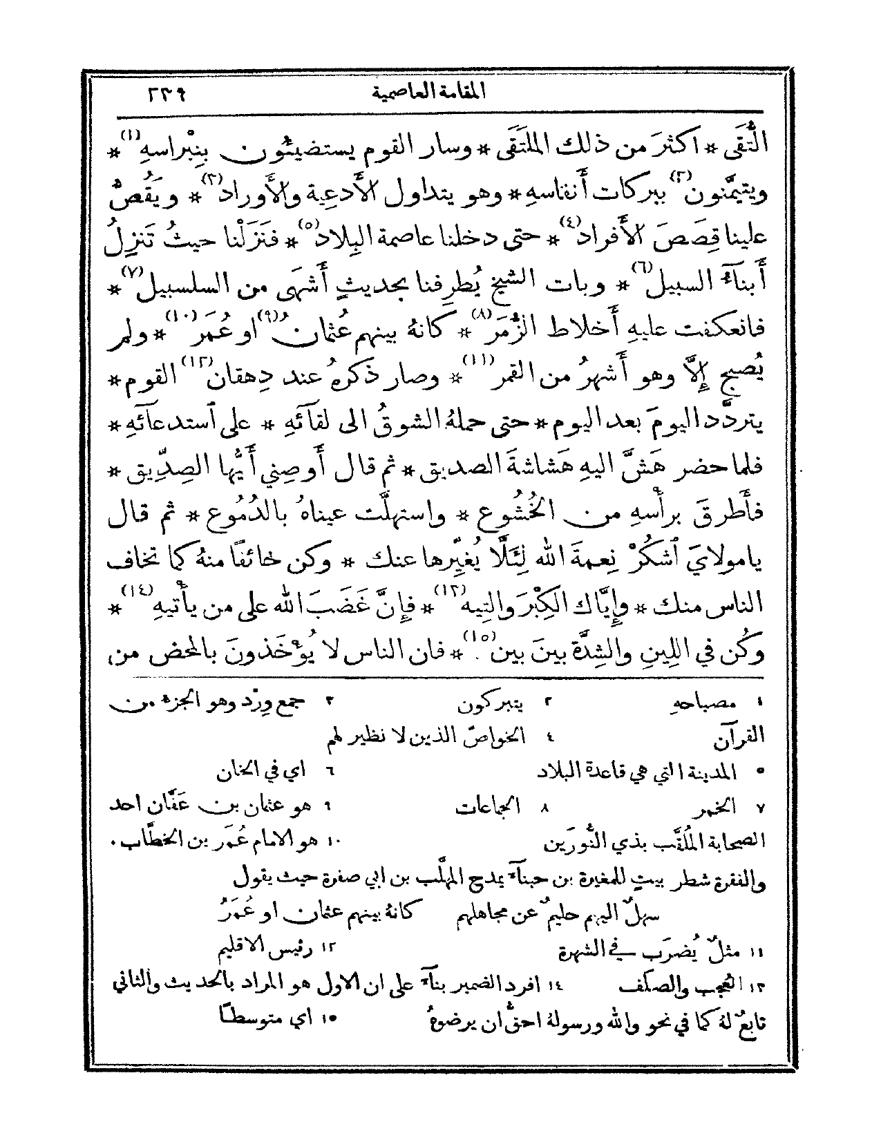 التقى، أكثر من ذلك الملتقى، وسار القوم يستضيئون بنبراسه، ويتيمنون ببركات أنفاسه. وهو يتداول الأدعية والأوراد، ويقص علينا قصص الأفراد، حتى دخلنا عاصمة البلاد. فنزلنا حيث تنزل أبناء السبيل، وبات الشيخ يطرفنا بحديث أشهى من السلسبيل. فانعكفت عليه أخلاط الزمر، كأنه بينهم عثمان أو عمر، ولم يصبح إلا وهو أشهر من القمر. وصار ذكره عند دهقان القوم، يتردد اليوم بعد اليوم. حتى حمله الشوق إلى لقائه، على استدعائه. فلما حضر هش إليه هشاشة الصديق، ثم قال: أوصني أيها الصديق. فأطرق برأسه من الخشوع، واستهلت عيناه بالدموع. ثم قال: يا مولاي اشكر نعمة الله لئلا يغيرها عنك، وكن خائفاً منه كما تخاف الناس منك. وإياك الكبر والتيه، فإن غضب الله على من يأتيه. وكن في اللين والشدة بين بين، فإن الناس لا يؤخذون بالمحض من