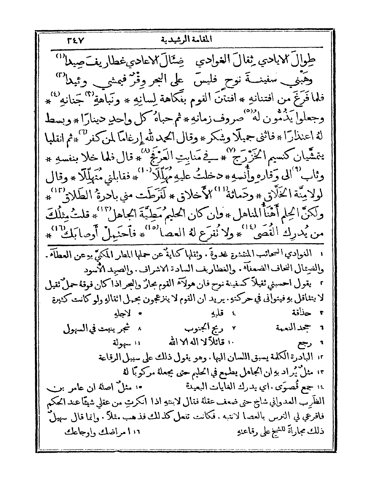 فلما فرغ من افتنانه، افتتن القوم بفكاهة لسان ونباهة جنانه، وجعلوا يذمون له صروف زمانه. ثم حباه كل واحد ديناراً وبسط له اعتذاراً. فأثنى جميلاً وشكر وقال الحمد الله إرغاماً لمن كفر. ثم انقلبا يتمشيان كنسيم الخزرج، في منابت العرفج. قال: فلما خلا بنفسه وثاب إلى وقاره وأنسه. دخلت عليه مهللاً. وقال: لولا منة الخلاق، ودماثة الأخلاق، لفرطت مني بإدارة الطلاق. ولكن الحلم أهنأ المناهل، وإن كان الحليم مطية الجاهل، قلت: مثلك من يدرك القصى، ولا تقرع له العصا. فاحتمل أوصابك،