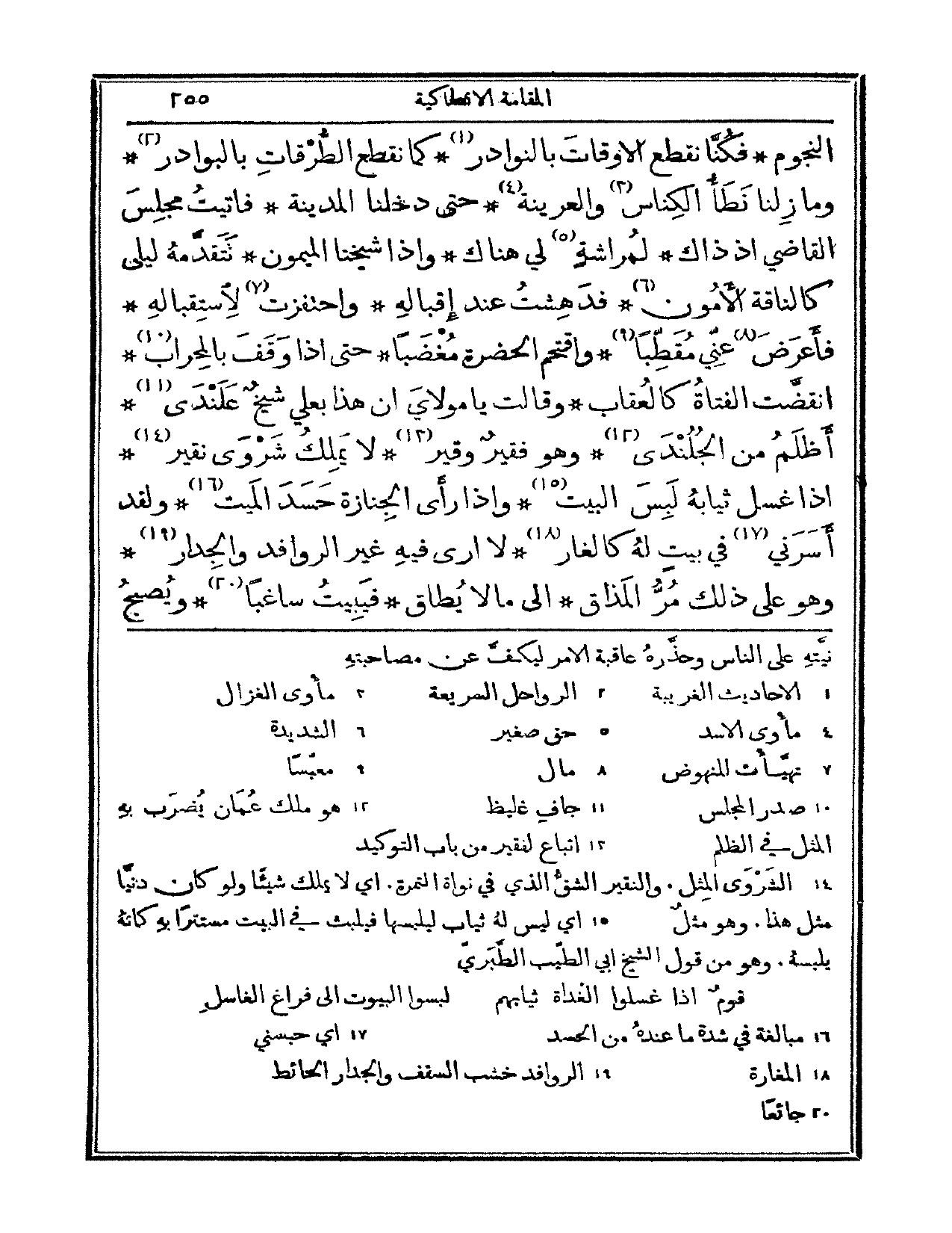 النجوم. فكنا نقطع الأوقات بالنوادر، كما نقطع الطرقات بالبوادر. وما زلنا نطأ الكناس والعرينة، حتى دخلنا المدينة. فأتيت مجلس القاضي إذ ذاك، لمراشةٍ لي هناك. وإذا سيخنا الميمون، تتقدمه ليلى كالناقة الأمون. فد هشت عند إقباله، واحتفزت لاستقباله. فأعرض عني مقطباً، واقتحم الحضرة مغضباً. حتى إذا وقف بالمحراب، انقضت الفتاة كالعقاب. وقالت: يا مولاي إن هذا بعلي شيخٌ علندى، أظلم من الجلندى وهو فقير وقير، لا يملك شروى نقير. إذا غسل ثيابه لبس البيت، وإذا رأى الجنازة حسد الميت. ولقد أسرني في بيت له كالغار، لا أرى فيه غير الروافد والجدار. وهو ذلك مر المذاق، إلى ما لا يطاق. فيبيت ساغباً، ويصبح