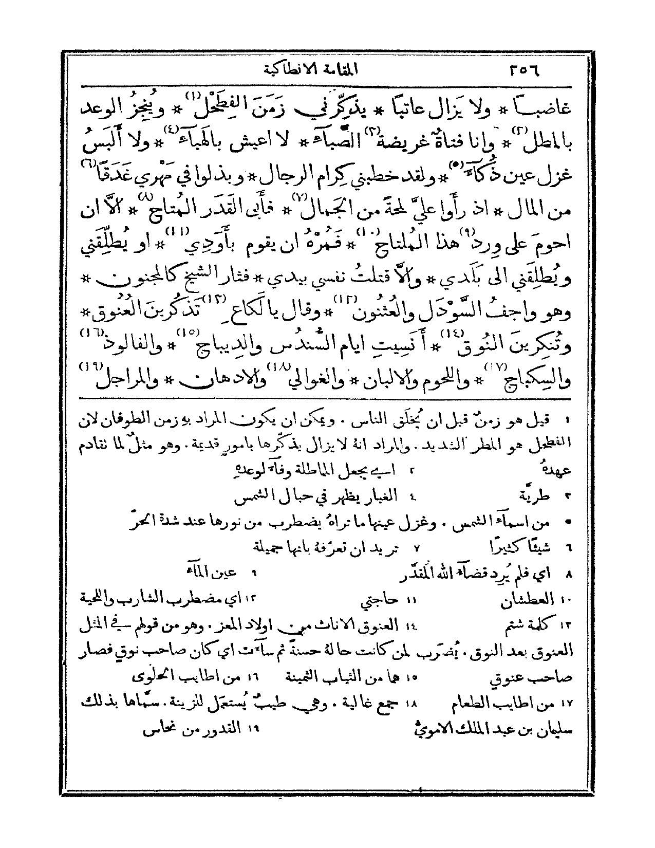غاضباً، ولا يزال عاتباً. يذكرني زمن الفطحل وينجز الوعد بالمطل. وأنا فتاةٌ غريضة الصبا لا أعيش بالهباء، ولا ألبس غزل عين ذكاء. ولقد خطبني كرام الرجال، وبذلوا في مهري غدقاً من المال، إذ رأوا علي لمحة من الجمال. فأبى القدر المتاح، إلا أن أحوم على ورد هذا الملتاح. فمره أن يقوم بأودي أو يطلقني ويطلقني إلى بلدي، وإلا قتلت نفسي بيدي. فثار الشيخ كالمجنون وهو واجف السودل والعثنون. وقال: يا لكاع تذكرين العنوق، وتنكرين النوق. أنسيت أيام السندس والديباج، والفالوذ والسكباج؟ واللحوم والألبان والغوالي والأدهان. والمراجل