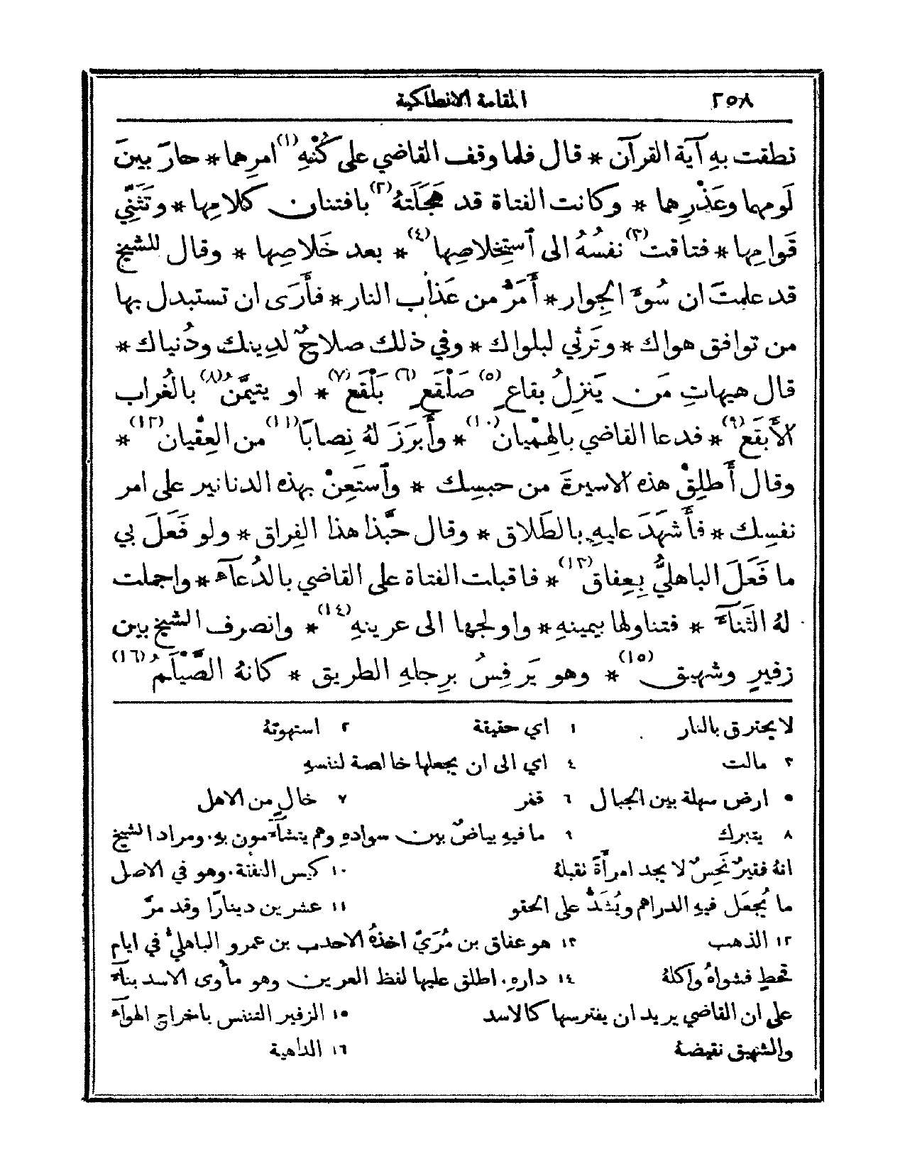 نطقت به آية القرآن. قال: فلما وقف القاضي على كنه أمرهما حار بين لومهما وعذرهما. وكانت الفتاة قد هجلته بافتنان كلامها، وتثني قوامها. فتاقت نفسه إلى استخلاصها، بعد خلاصها. وقال للشيخ: قد علمت أن سوء الجوار، أمر من عذاب النار. فأرى أن تستبدل بها من توافق هواك وترثي لبلواك، وفي ذلك صلاح لدينك ودنياك. قال: هيهات من ينزل بقاع صلقعٍ بلقع، أو يتيمن بالغراب الأبقع؟ فدعا القاضي بالهميان، وأبرز له نصاباً من العقيان. وقال: أطلق هذه الأسيرة من حبسك، واستعن بهذه الدنانير على أمر نفسك. فأشهد عليه بالطلاق، وقال: حبذا هذا الفراق ولو فعل بي ما فعل الباهلي بعفاق. فأقبلت الفتاة على القاضي بالدعاء، وأجملت له الثناء. فتناولها بيمينه وأولجها إلى عرينه. وانصرف الشيخ بين زفير وشهيق، وهو يرفس برجله الطريق، كأنه الصيلم