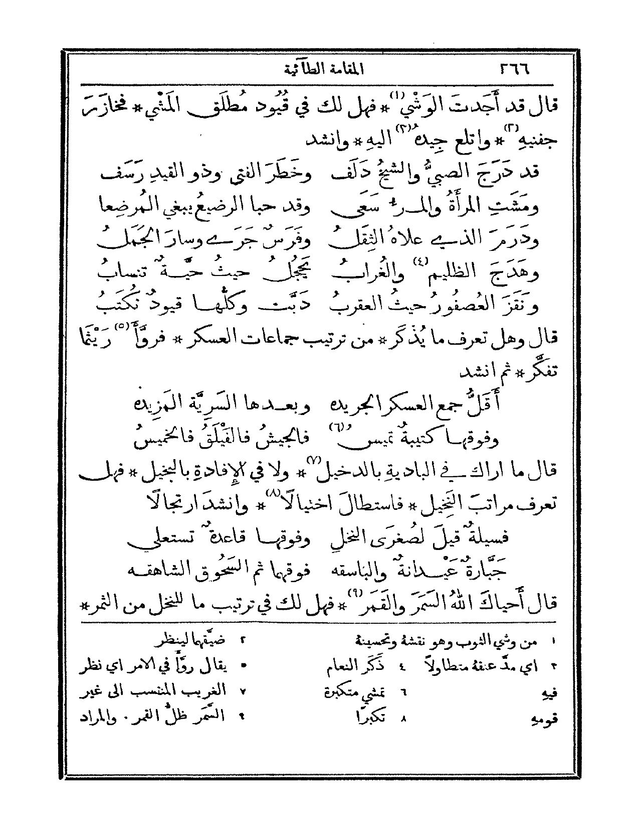 قال: وهل تعرف ما يذكر، من ترتيب جماعات العسكر؟ فروأ ريثما تفكر. ثم أنشد: