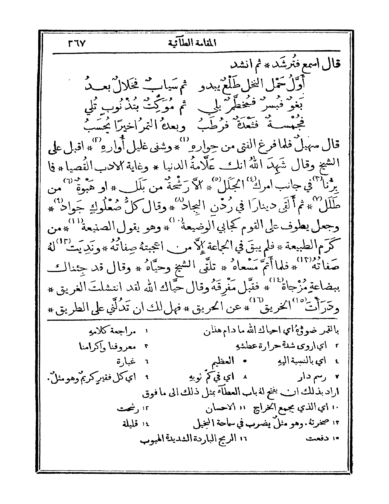 قال سهيل: فلما فرغ الفتى من حواره، وشفى غليل أواره. أقبل على الشيخ وقال: شهد الله أنك علامة الدنيا، وغاية الأدب القصيا. فما برنا في جانب أمرك الجلل إلا رشحة من بلل، أو هبوةٌ من طلل. ثم ألقى ديناراً في ردن البجاد، وقال: كل صعلوك جواد وجعل يطوف على القوم كجابي الوضيعة، وهو يقول: الصنيعة، من كرم الطبيعة. فلم يبق في الجماعة إلا من أعجبته صفاته، ونديت له صفاته. فلما أتم مسعاه، تلقى الشيخ وحياه، وقال: قد جئناك ببضاعة مزجاة. فقبل مفرقه وقال: حياك الله لقد انتشلت الغريق ودرأت الخريق، عن الحريق، فهل لك أن تدلني على الطريق؟