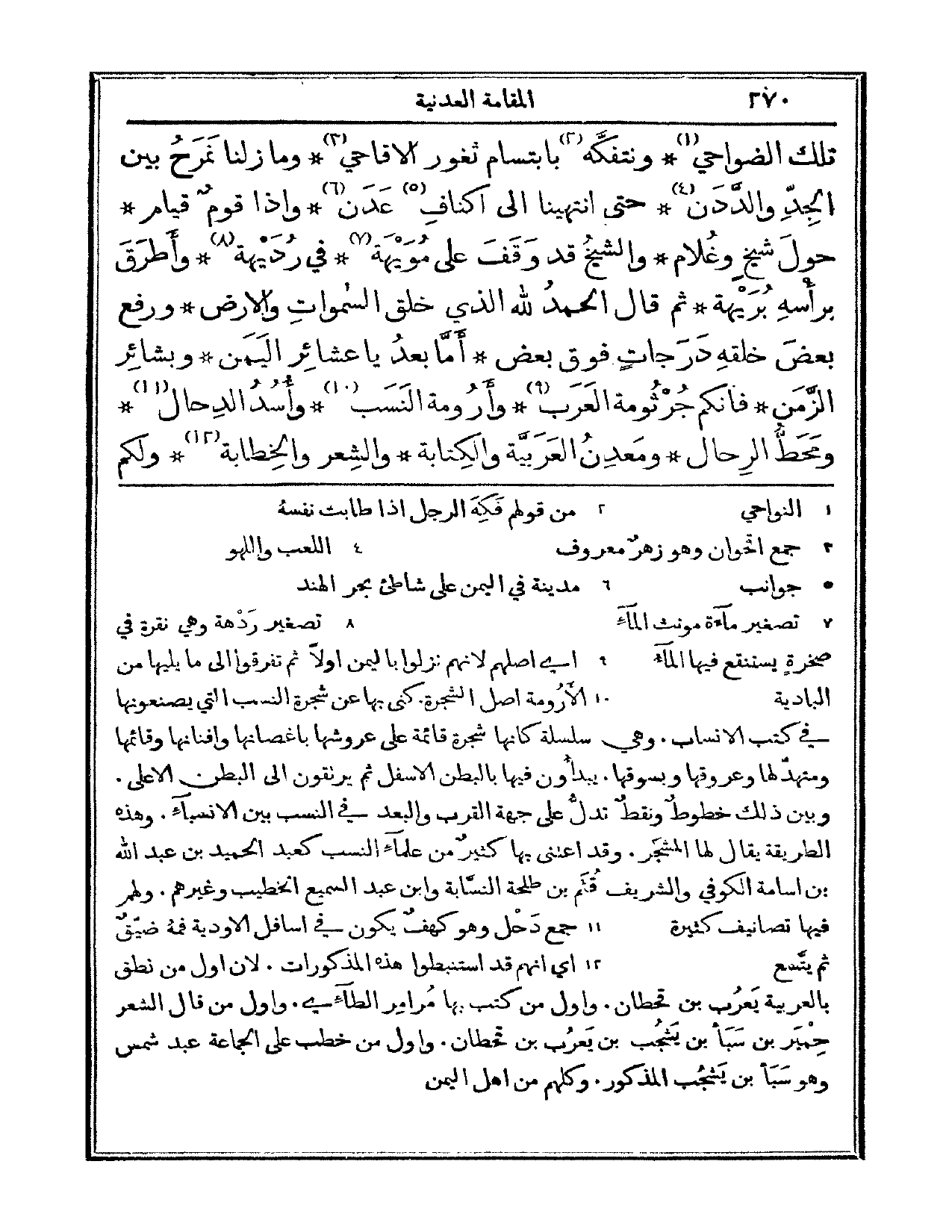 تلك الضواحي، وتنفكه بابتسام ثغور الأقاحي. وما زلنا نمرح بين الجد والددن، حتى انتهينا إلى أكناف عدن. وإذا قومٌ قيام، حول شيخ وغلام. والشيخ قد وقف على مويهة، في رديهة وأطرق برأسه بريهة. ثم قال: الحمد لله الذي خلق السموات والأرض، ورفع بعض خلقه درجات فوق بعض. أما بعد يا عشائر اليمن، وبشائر الزمن. فإنكم جرثومة العرب وأرومة النسب. وأسد الدحال، ومحط الرحال. ومعدن العربية والكتابة، والشعر والخطابة. ولكم