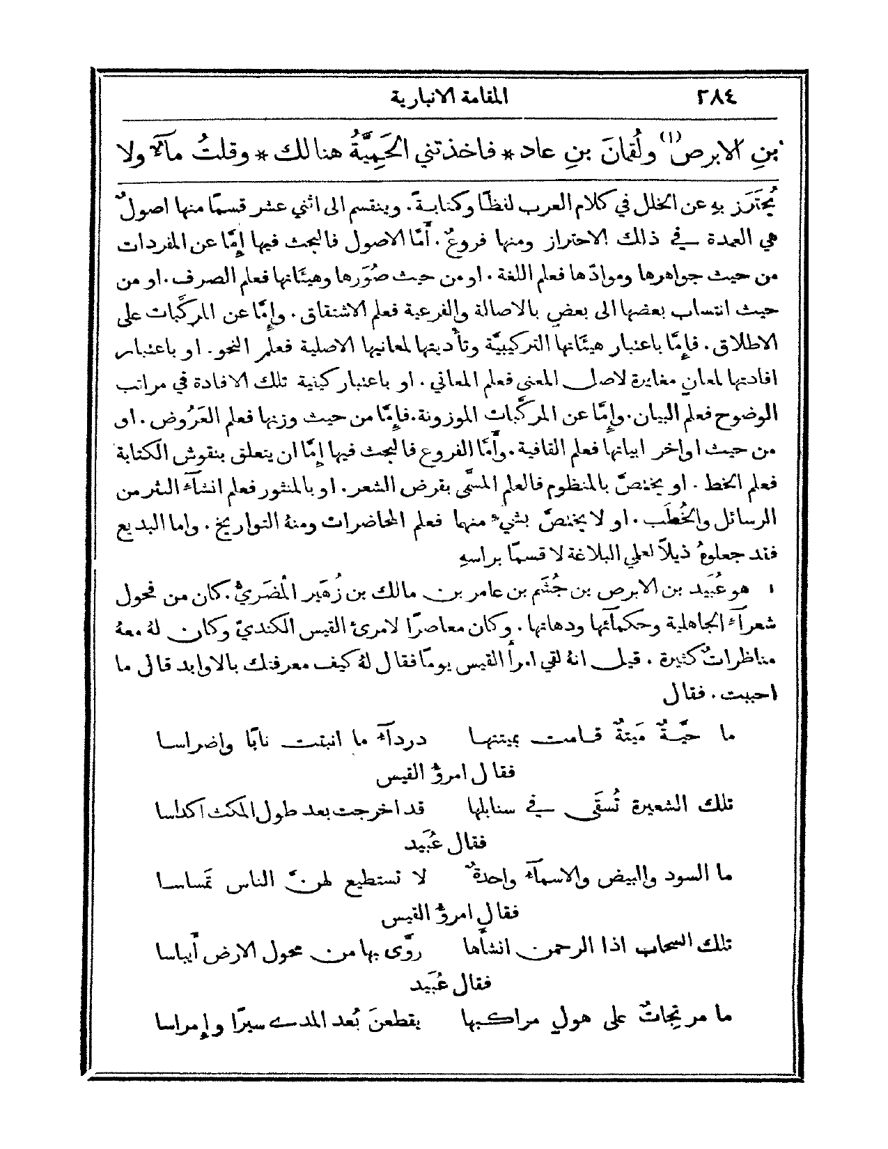 بن الأبرص ولقمان بن عاد فأخذتني الحمية هنالك، وقلت: ماء ولا