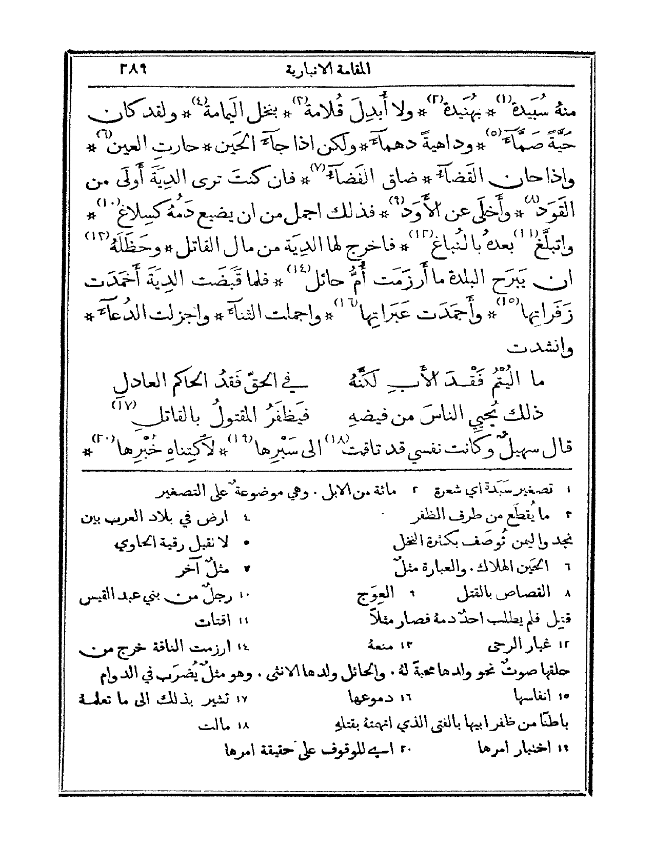 منه سبيدة، بهنيدة. ولا أبدل قلامة، بنخل اليمامة. ولقد كان حية صماء، وداهية دهاء. ولكن إذا جاء الحين حارت العين. وإذا حان القضاء ضاق الفضاء. فإن كنت ترى الدية أولى من القود، وأخلى عن الأود. فذلك أجمل من أن يضيع دمه كسلاغ، وأتبلغ بعده بالنباغ. فأخرج لها الدية من مال القاتل، وحظله أن يبرح البلدة ما أرزمت أم حائل. فلما قبضت الدية أخمدت زفراتها، وأجمدت عبراتها. وأجملت الثناء وأجزلت الدعاء. وأنشدت: