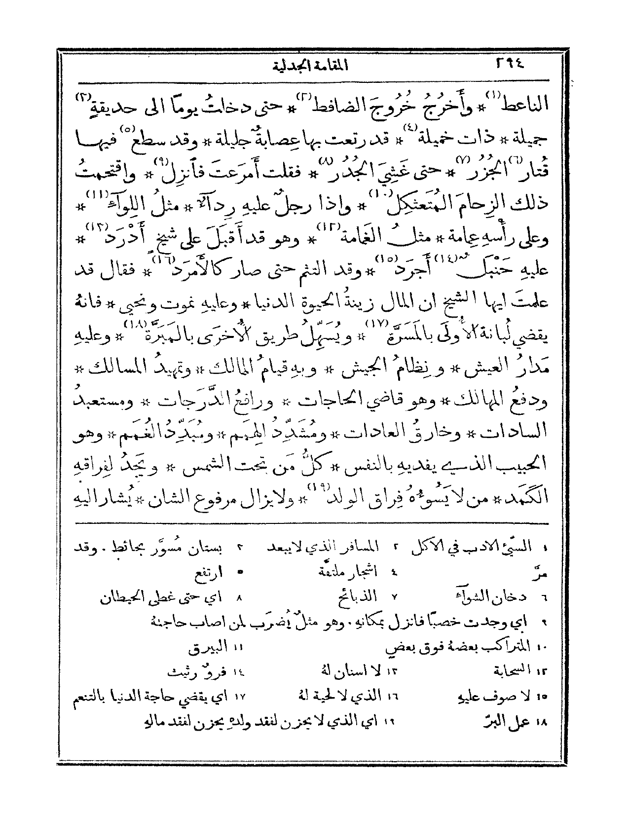 الناعط، وأخرج خرج الضافط. حتى دخلت يوماً إلى حديقة جميلة ذات جميلة، قد رتعت بها عصابة جليلة. وقد سطع فيها قتار الجزر، حتى غشي الجدر، فقلت: أمرعت فانزل، واقتحمت ذلك الزحام المتعثكل. وإذا رجل عليه رداء، مثل اللواء. وعلى رأسه عمامة مثل الغمامة. وهو قد أقبل على شيخ أدرد، عليه حنبل أجرد وقد التثم حتى صار كالأمرد. فقال: قد علمت أيها الشيخ أن المال زينة الحيوة الدنيا، وعليه نموت ونحيا. فإنه يقضي لبانة الأولى بالمسرة، ويسهل طريق الأخرى بالمبرة. وعليه مدار العيش ونظام الجيش. وبه قيام الممالك وتمهيد المسالك، ودفع المهالك. وهو قاضي الحاجات ورافع الدرجات ومستعبد السادات، وخارق العادات. ومشدد الهمم ومبدد الغمم. وهو الحبيب الذي يفديه بالنفس، كل من تحت الشمس. ويجد لفراقه الكمد، من لا يسوءه فراق الولد. ولا يزال مرفوع الشان، يشار إليه