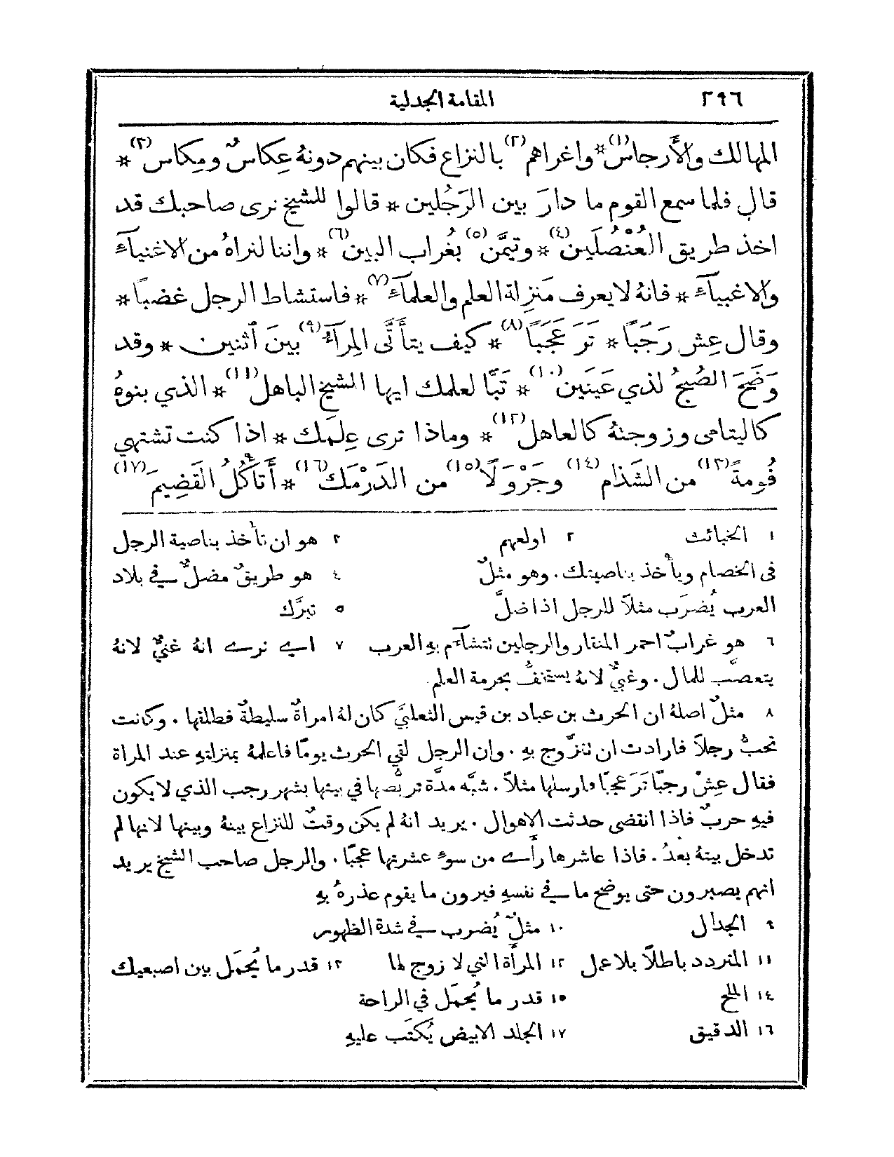 المهالك والأرجاس، وأغراهم بالنزاع فكان بينهم دونه عكاس ومكاس. قال: فلما سمع القوم ما دار بين الرجلين، قالوا للشيخ: نرى صاحبك قد أخذ طريق العنصلين وتيمن بغراب البين. وإننا لنراه من الأغنياء والأغبياء، فإنه لا يعرف منزلة العلم والعلماء. فاستشاط الرجل غضباً، وقال: عش رجباً، تر عجباً. كيف يتأتى المراء بين اثنين وقد وضح الصبح لذي عينين. تباً لعلمك أيها الشيخ الباهل الذي بنوه كاليتامى وزوجته كالعاهل. وماذا ترى علمك، إذا كنت تشتهي فومة من الشذام وجرولاً من الدرمك؟ أتأكل القضيم