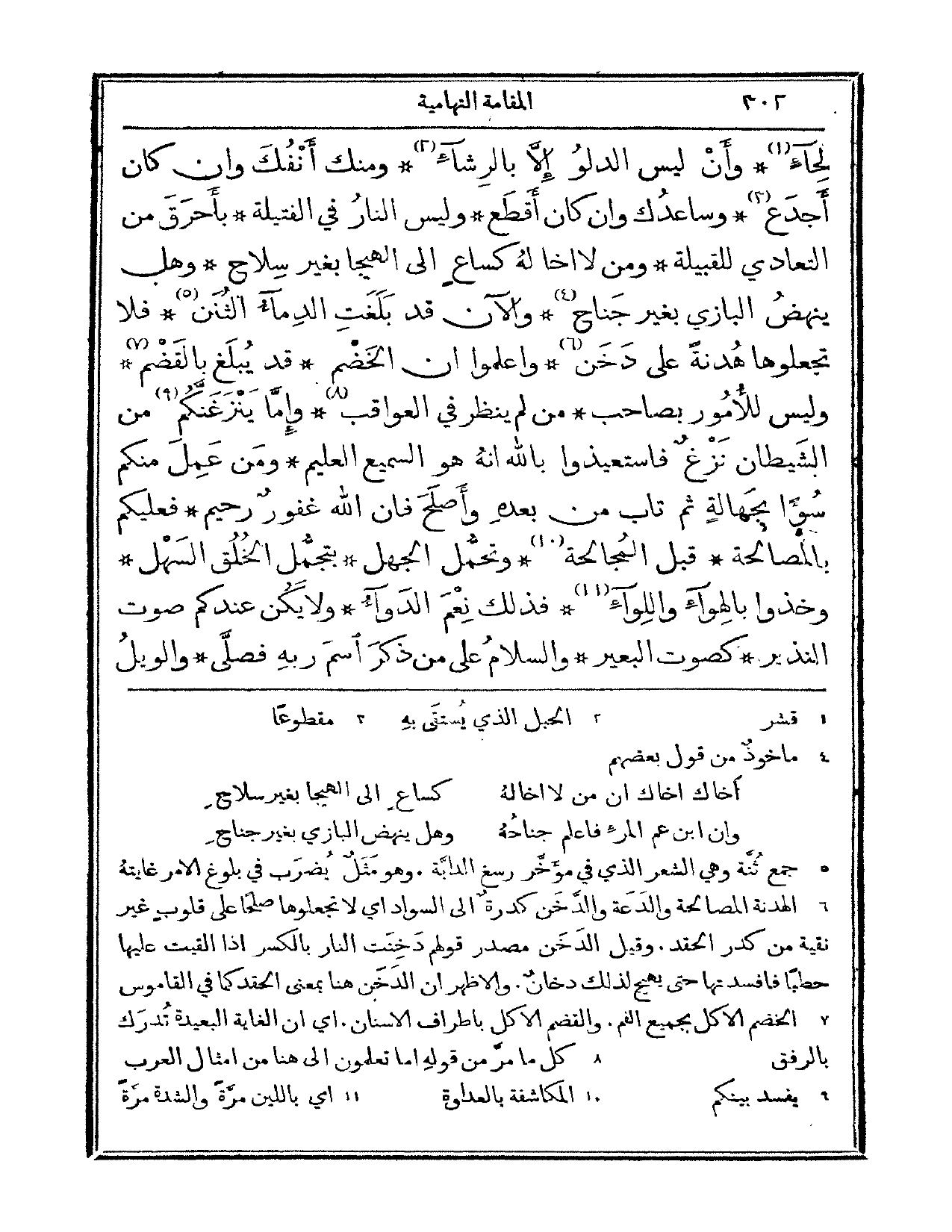 لحاء، وأن ليس الدلو إلا بالرشاء. ومنك أنفسك وإن كان أجدع، وساعدك وإن كان أقطع. وليس النار في الفتيلة بأحرق من التعادي للقبيلة. ومن لا أخا له كساع إلى الهيجا بغير سلاح، وهل ينهض البازي بغير جناح. والآن قد بلغت الدماء الثنن، فلا تجعلوها هدنة على دخن. واعلموا أن الخضم قد يبلغ بالقضم. وليس للأمور بصاحب، من لم ينظر في العواقب. وإما ينزغنكم من الشيطان نزغ فاستعيذوا بالله إنه هو السميع العليم، ومن عمل منكم سوءاً بجهالة ثم تاب من بعده وأصلح فإن الله غفور رحيم. فعليكم بالمصالحة قبل المجالحة. وتحمل الجهل بتجمل الخلق السهل. وخذوا بالهواء واللواء فذلك نعم الدواء. ولا يكن عندكم صوت النذير كصوت البعير. والسلام على من ذكر اسم ربه فصلى، والويل