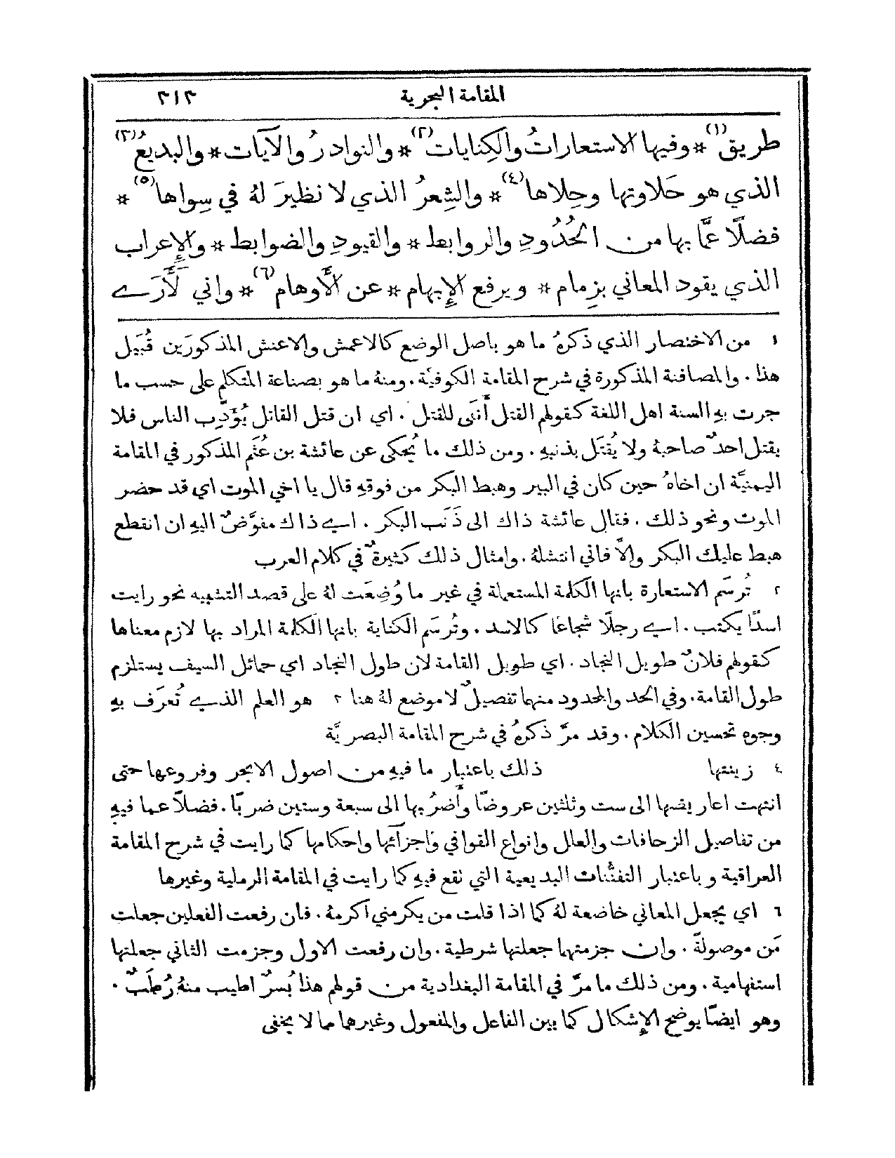 طريق. وفيها الاستعارات والكنايات، والنوادر والآيات. والبديع الذي هو حلاوتها وحلاها، والشعر الذي لا نظير له في سواها. فضلاً عما بها من الحدود والروابط والقيود والضوابط. والإعراب الذي يقود المعاني بزمام، ويرفع الإبهام، عن الأوهام. وإني لأرى