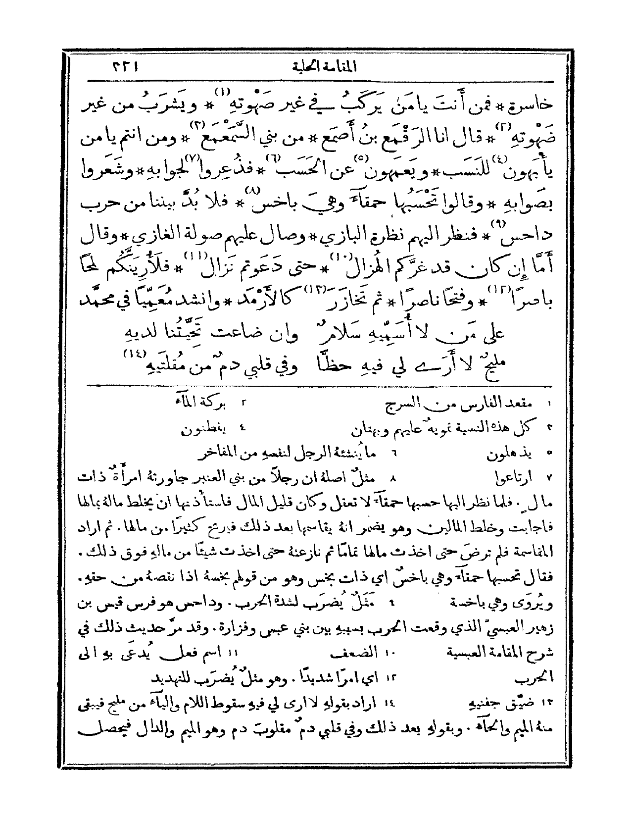 خاصرة. فمن أنت يا من يركب في غير صهوته، ويشرب من غير ضهوته؟ قال: أنا الرقمع بن أصمع من بني السمعمع. ومن أنتم يا من يأبهون للنسب، ويعمهون عن الحسب؟ فذعروا لجوابه، وشعروا بصوابه. وقالوا: تحسبها حمقاء وهي باخس، فلا بد بيننا من حرب داحس. فنظر إليهم نظرة البازي وصال عليهم صولة الغازي. وقال: أما إن كان قد غركم الهزال، حتى دعوتم نزال. فلأرينكم لمحاً باصراً، وفتحتاً ناصراً. ثم تخازر كالأرمد وأنشد معمياً في محمد:
