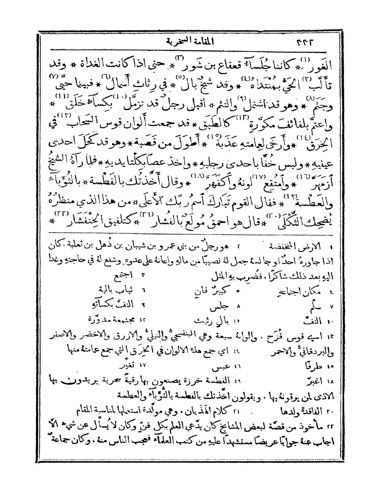 الغور، كأننا جلساء قعقاع بن شور. حتى إذا كانت الغداة وقد تألب الحي بمنتداه. وفد شيخ بال، في رثاث أسمال. فبينما حي وجثم وهو قد اشتمل والتثم. أقبل رجل قد تزمل بكساء خلق واعتم بلفائف مكورة كالطبق، قد جمعت ألوان قوس السحاب في الخرق. وأرخى لعمامته عذبة أطول من قصبة. وهو قد كحل إحدى عينيه ولبس خفاً بإحدى رجليه، وأخذ عصاً بكلتا يديه. فلما رآه الشيخ ازمهر وامتقع لونه واكفهر. وقال: أخذتك بالفطسة، بالثؤباء والعطسة. فقال القوم: تبارك اسم ربك الأعلى، من هذا الذي منظره يضحك الثكلى؟ قال: هو أحمق مولع بالفشار، كتلفيق الخنفشار.