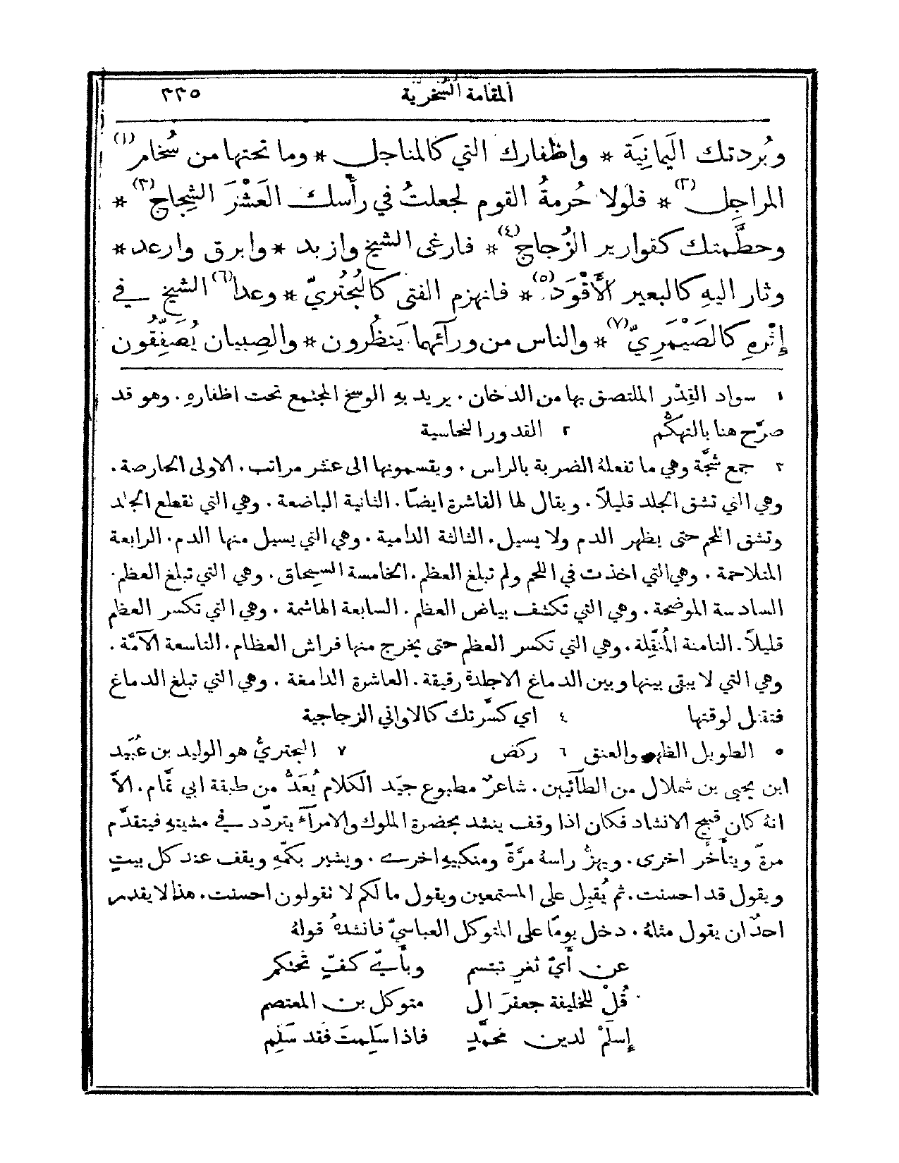 وبردتك اليمانية وأظفارك التي كالمناجل وما تحتها من سخام المراجل؟ فلولا حرمة القوم لجعلت في رأسك العشر الشجاج، وحطمتك كقوارير الزجاج فأرغى الشيخ وأزبد وأبرق وأرعد، وثار إليه كالبعير الأقود. فانهزم الفتى كالبحتري وعدا الشيخ في غثره كالصيمري. والناس من ورائهما ينظرون، والصبيان يصفقون