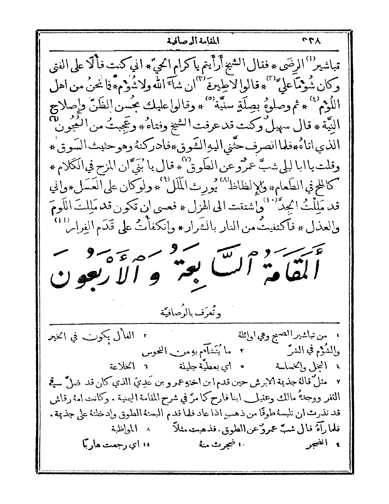 تباشير الرضى. فقال الشيخ: أرأيتم يا كرام الحي، إني كنت فألا على الفتى وكان شؤماً علي؟ قالوا: لا طيرة إن شاء ولا شؤم، فما نحن من أهل اللؤم. ثم وصلوه بصلة سنية وقالوا: عليك بحسن الظن وإصلاح النية. قال سهيل: وكنت قد عرفت الشيخ وفتاه، وعجبت من المجون الذي أتاه. فلما انصرف حثني إليه الشوق فأدركته وهو حثيث السوق، وقلت: يا أبا ليلى شب