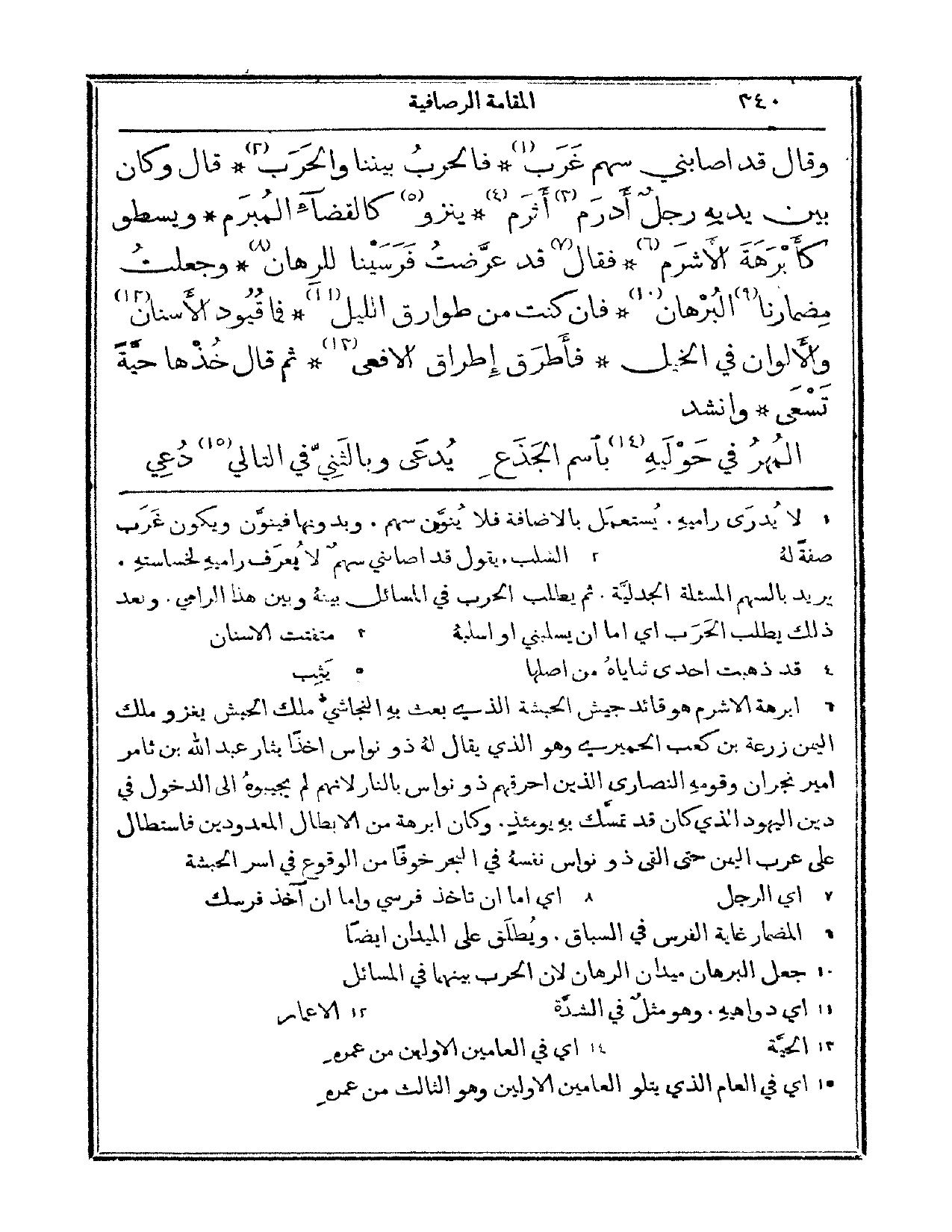 وقال: قد أصابني سهم غرب، فالحرب بيننا والحرب. قال: وكان بين يديه رجل أدرم أثرم، ينزو كالقضاء المبرم ويسطو كأبرهة الأشرم. فقال: قد عرضت فرسينا للرهان، وجعلت مضمارنا البرهان. فإن كنت من طوارق الليل، فما قيود الأسنان والألوان في الخيل؟ فأطرق إطراق الأفعى، ثم قال: خذها حية تسعى، وأنشد:
