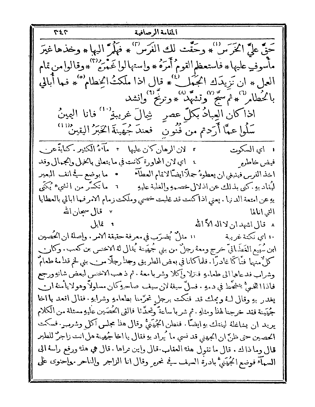 حق علي الخرس وحقت لك الفرس. فهلم إليه وخذها غير مأسوف عليها. فاستعظم القوم أمره، واستهالوا غمره. وقالوا: من تمام العمل، أن نزيدك الجمل. قال: إذا ملكت الخطام، فما أبالي بالحطام. ثم سبح وتشهد وترنح وأنشد: