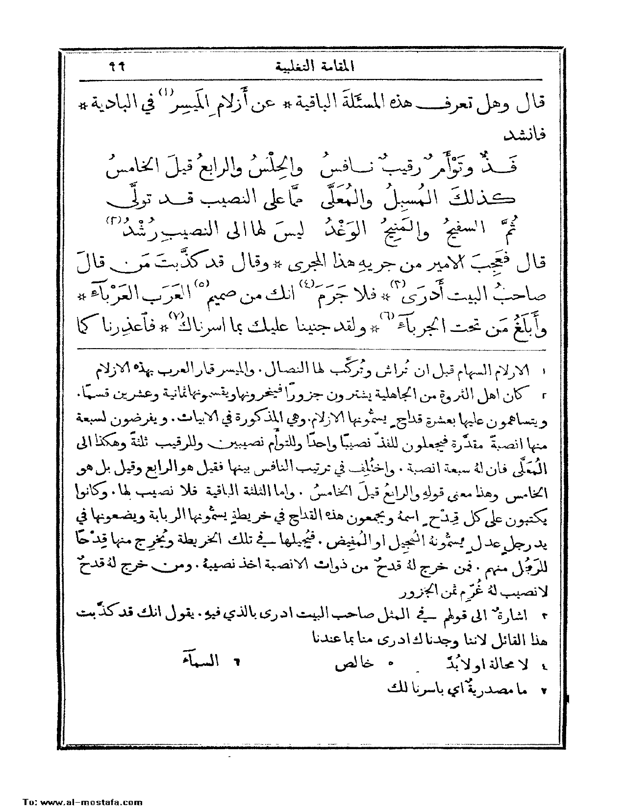 قال: وهل تعرف هذه المسألة الباقية، عن أزلام الميسر في البادية؟ فأنشد: