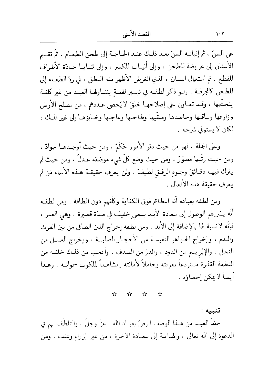 عَن السن ثمَّ إنباته السن بعد ذَلِك عِنْد الْحَاجة إِلَى طحن الطَّعَام ثمَّ تَقْسِيم الْأَسْنَان إِلَى عريضة للطحن وَإِلَى أَنْيَاب للكسر وَإِلَى ثنايا حادة الْأَطْرَاف للْقطع ثمَّ اسْتِعْمَال اللِّسَان الَّذِي الْغَرَض الْأَظْهر مِنْهُ النُّطْق فِي رد الطَّعَام إِلَى المطحن كالمجرفة وَلَو ذكر لطفه فِي تيسير لقْمَة يَتَنَاوَلهَا العَبْد من غير كلفة يتجشمها وَقد تعاون على إصلاحها خلق لَا يُحْصى عَددهمْ من مصلح الأَرْض وزارعها وساقيها وحاصدها ومنقيها وطاحنها وعاجنها وخابزها إِلَى غير ذَلِك لَكَانَ لَا يَسْتَوْفِي شَرحه