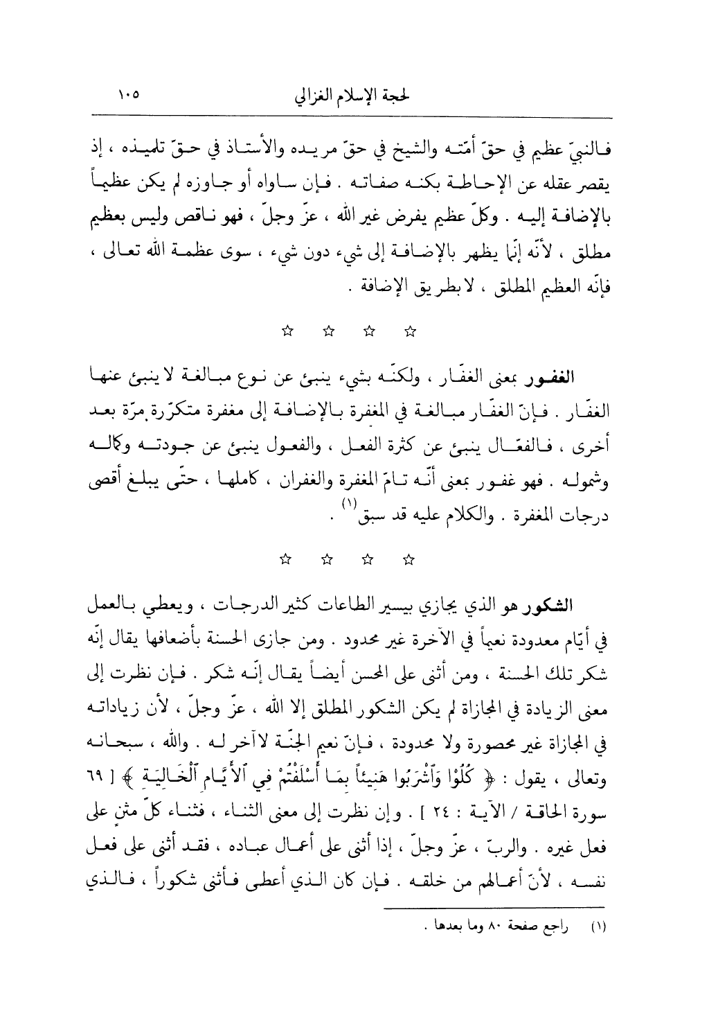 فالنبي عَظِيم فِي حق أمته وَالشَّيْخ فِي حق مريده والأستاذ فِي حق تِلْمِيذه إِذْ يقصر عقله عَن الْإِحَاطَة بكنه صِفَاته فَإِن ساواه أَو جاوزه لم يكن عَظِيما بِالْإِضَافَة إِلَيْهِ وكل عَظِيم يفْرض غير الله عز وَجل فَهُوَ نَاقص وَلَيْسَ بعظيم مُطلق لِأَنَّهُ إِنَّمَا يظْهر بِالْإِضَافَة إِلَى شَيْء دون شَيْء سوى عَظمَة الله تَعَالَى فَإِنَّهُ الْعَظِيم الْمُطلق لَا بطرِيق الْإِضَافَة