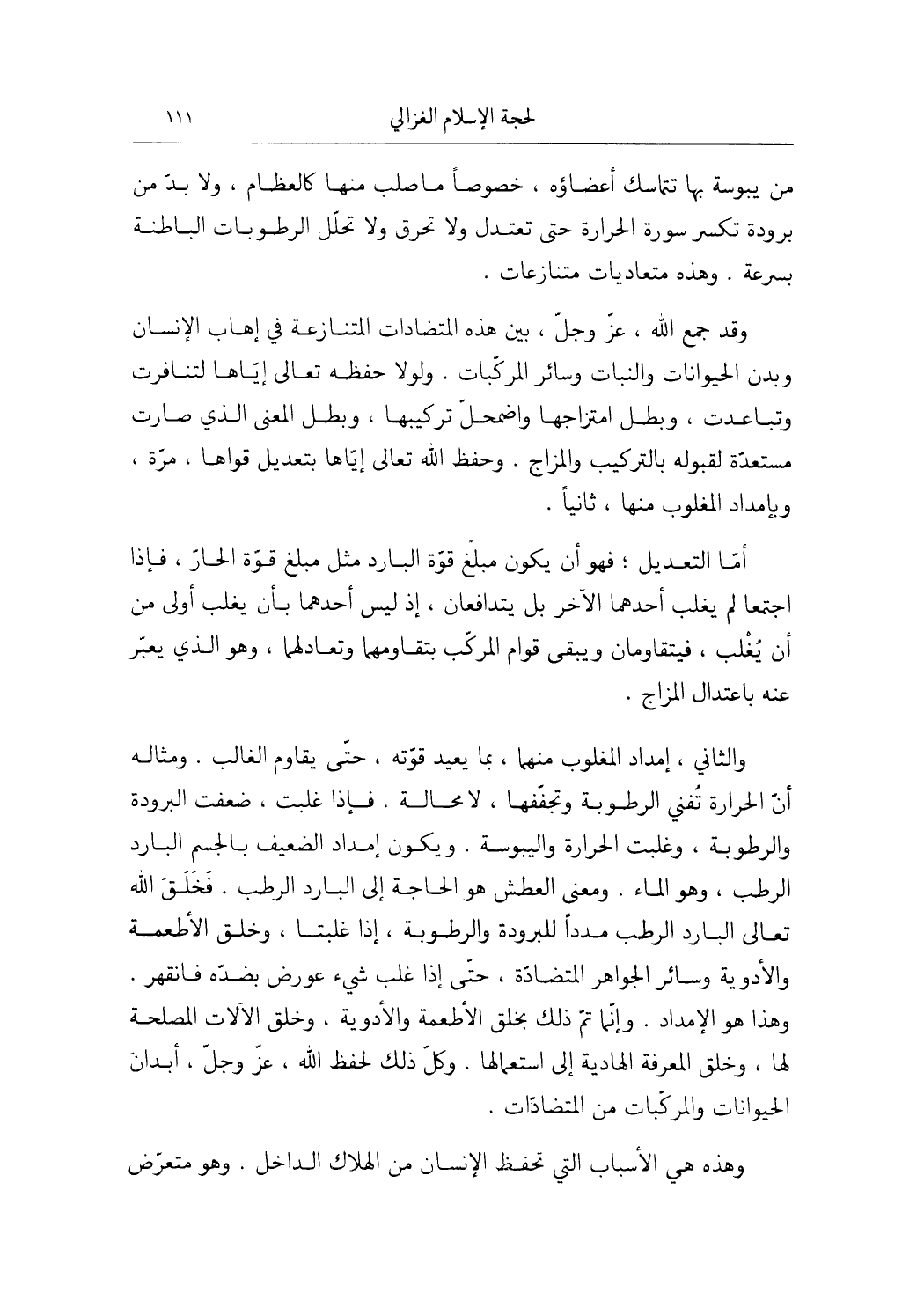 وَالثَّانِي إمداد المغلوب مِنْهُمَا بِمَا يُعِيد قوته حَتَّى يُقَاوم الْغَالِب ومثاله أَن الْحَرَارَة تفني الرُّطُوبَة وتجففها لَا محَالة فَإِذا غلبت ضعفت الْبُرُودَة والرطوبة وغلبت الْحَرَارَة واليبوسة وَيكون إمداد الضَّعِيف بالجسم الْبَارِد الرطب وَهُوَ المَاء وَمعنى الْعَطش هُوَ الْحَاجة إِلَى الْبَارِد الرطب فخلق الله تَعَالَى الْبَارِد الرطب مدَدا للبرودة والرطوبة إِذا غلبتا وَخلق الْأَطْعِمَة والأدوية وَسَائِر الْجَوَاهِر المتضادة حَتَّى إِذا غلب شَيْء عورض بضده فانقهر وَهَذَا هُوَ الْإِمْدَاد وَإِنَّمَا تمّ ذَلِك بِخلق الْأَطْعِمَة والأدوية وَخلق الْآلَات الْمصلحَة لَهَا وَخلق الْمعرفَة الهادية إِلَى اسْتِعْمَالهَا وكل ذَلِك لحفظ الله عز وَجل أبدان الْحَيَوَانَات والمركبات من المتضادات