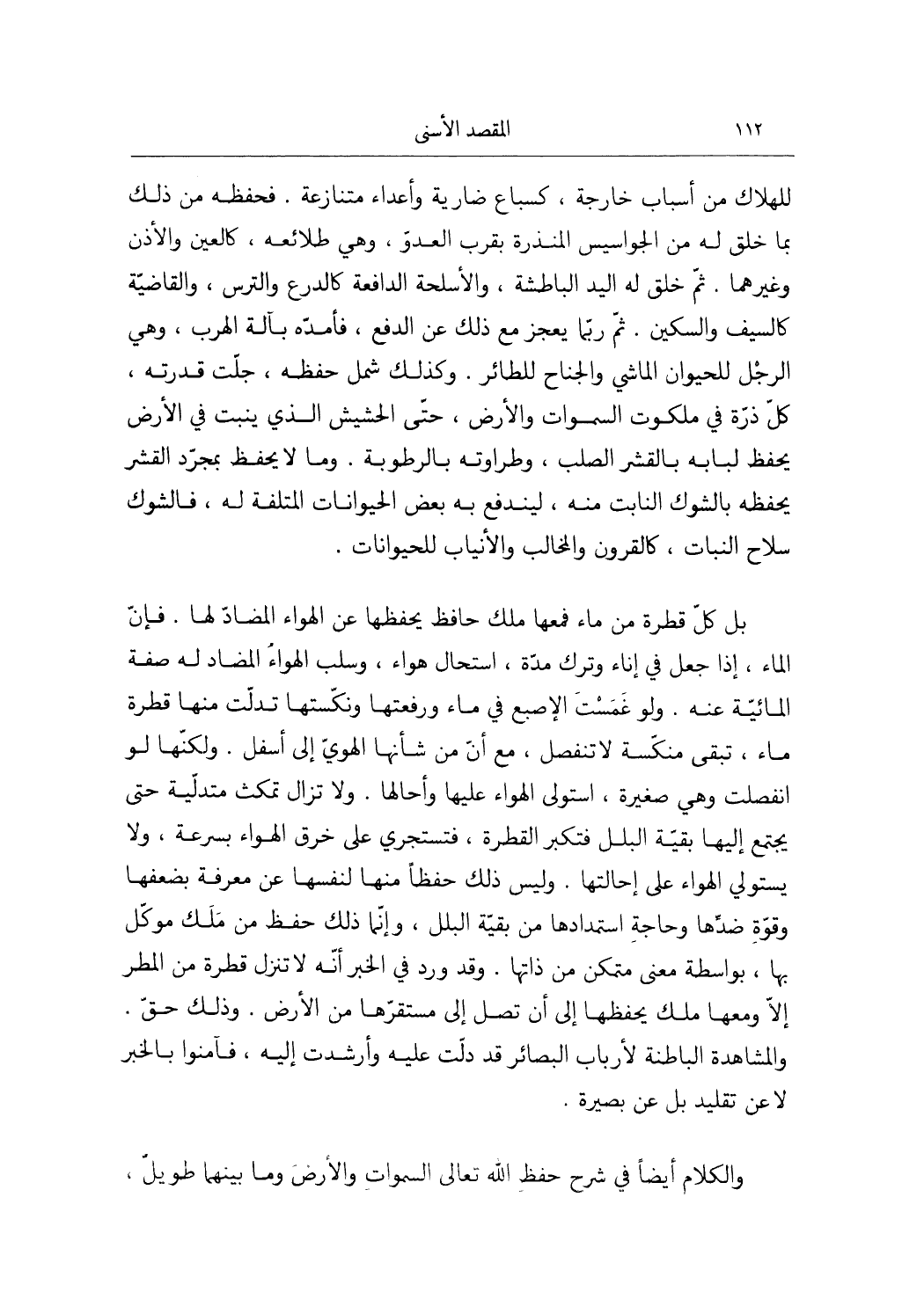 للهلاك من أَسبَاب خَارِجَة كسباع ضارية وأعداء متنازعة فحفظه من ذَلِك بِمَا خلق لَهُ من الجواسيس المنذرة بِقرب الْعَدو وَهِي طلائعه كَالْعَيْنِ وَالْأُذن وَغَيرهمَا ثمَّ خلق لَهُ الْيَد الباطشة والأسلحة الدافعة كالدرع والترس والقاضية كالسيف والسكين ثمَّ رُبمَا يعجز مَعَ ذَلِك عَن الدّفع فأمده بِآلَة الْهَرَب وَهِي الرجل للحيوان الْمَاشِي والجناح للطائر وَكَذَلِكَ شَمل حفظه جلت قدرته كل ذرة فِي ملكوت السَّمَوَات وَالْأَرْض حَتَّى الْحَشِيش الَّذِي ينْبت فِي الأَرْض يحفظ لبابه بالقشر الصلب وطراوته بالرطوبة وَمَا لَا يحفظ بِمُجَرَّد القشر يحفظه بالشوك النَّابِت مِنْهُ ليندفع بِهِ بعض الْحَيَوَانَات المتلفة لَهُ فالشوك سلَاح النَّبَات كالقرون والمخالب والأنياب للحيوانات