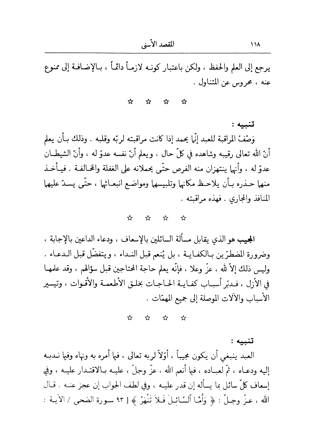 هُوَ الَّذِي يُقَال مَسْأَلَة السَّائِلين بالإسعاف وَدُعَاء الداعين بالإجابة وضرورة الْمُضْطَرين بالكفاية بل ينعم قبل النداء ويتفضل قبل الدُّعَاء وَلَيْسَ ذَلِك إِلَّا لله عز وَعلا فَإِنَّهُ يعلم حَاجَة المحتاجين قبل سُؤَالهمْ وَقد علمهَا فِي الْأَزَل فدبر أَسبَاب كِفَايَة الْحَاجَات بِخلق الْأَطْعِمَة والأقوات وتيسير الْأَسْبَاب والآلات الموصلة إِلَى جَمِيع الْمُهِمَّات تَنْبِيه