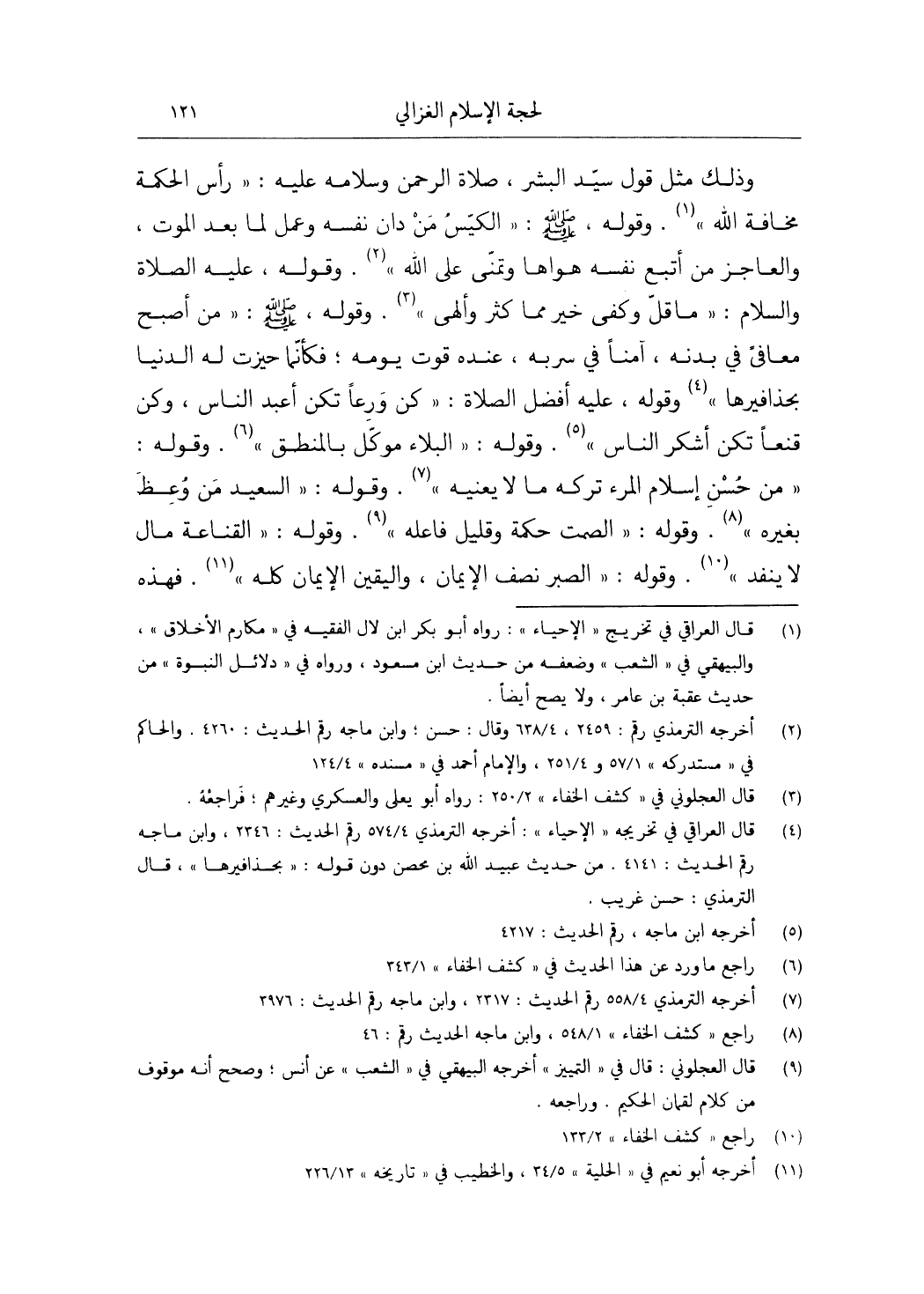 وَذَلِكَ مثل قَول سيد الْبشر صَلَاة الرَّحْمَن وَسَلَامه عَلَيْهِ رَأس الْحِكْمَة مَخَافَة الله وَقَوله صلى الله عَلَيْهِ وَسلم الْكيس من دَان نَفسه وَعمل لما بعد الْمَوْت وَالْعَاجِز من أتبع نَفسه هَواهَا وَتمنى على الله وَقَوله عَلَيْهِ الصَّلَاة وَالسَّلَام مَا قل وَكفى خيرا مِمَّا كثر وألهى وَقَوله صلى الله عَلَيْهِ وَسلم من أصبح معافى فِي بدنه آمنا فِي سربه عِنْده قوت يَوْمه فَكَأَنَّمَا حيزت لَهُ الدُّنْيَا بحذافيرها وَقَوله عَلَيْهِ أفضل الصَّلَاة كن ورعا تكن أعبد النَّاس وَكن قنعا تكن أشكر النَّاس وَقَوله الْبلَاء مُوكل بالْمَنْطق وَقَوله من حسن إِسْلَام الْمَرْء تَركه مَا لَا يعنيه وَقَوله السعيد من وعظ بِغَيْرِهِ وَقَوله الصمت حِكْمَة وَقَلِيل فَاعله وَقَوله القناعة مَال لَا ينْفد وَقَوله الصَّبْر نصف الْإِيمَان وَالْيَقِين الْإِيمَان كُله فَهَذِهِ