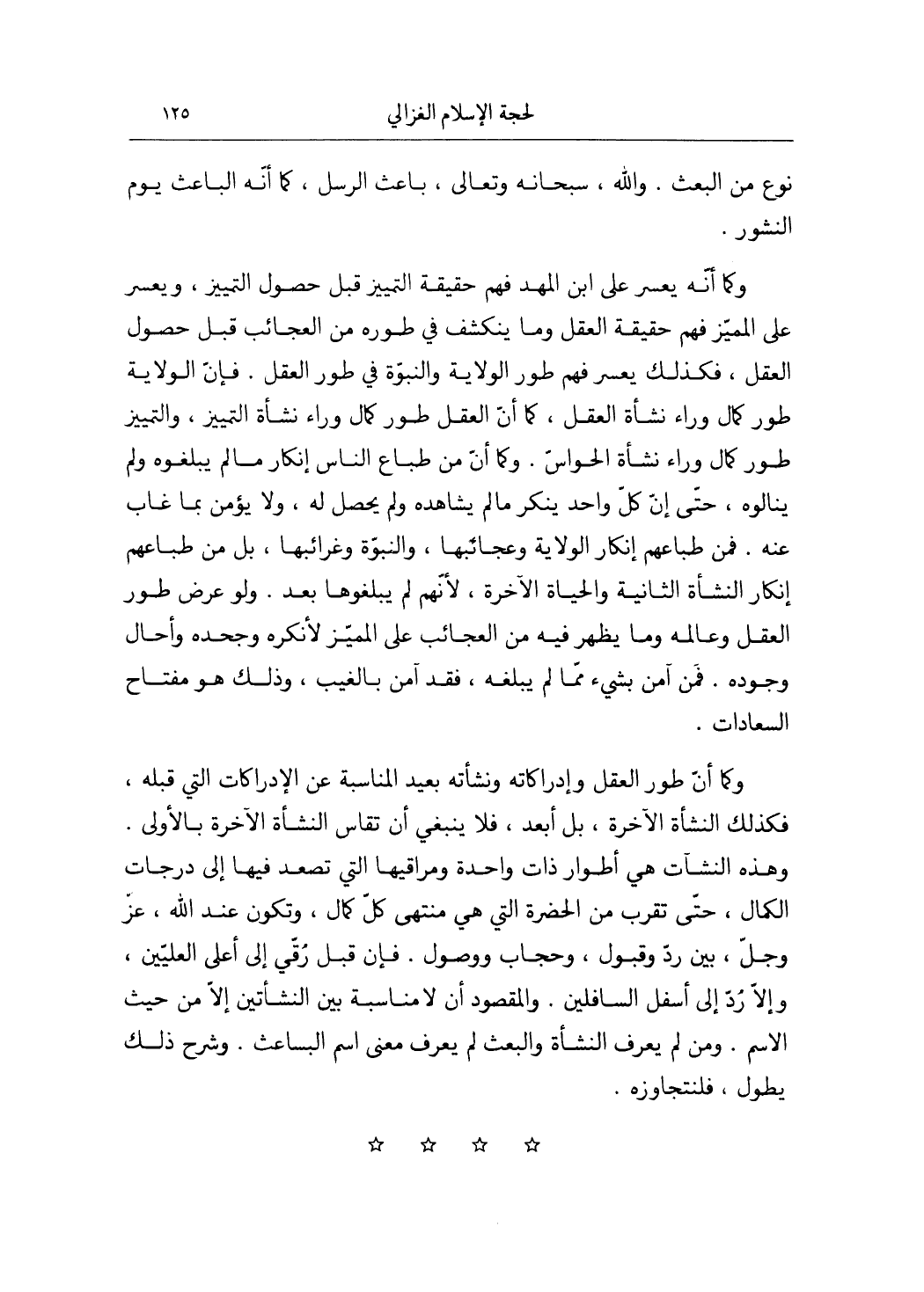 وكما أَن طور الْعقل وإدراكاته ونشأته بعيد الْمُنَاسبَة عَن الإدراكات الَّتِي قبله فَكَذَلِك النشأة الْآخِرَة بل أبعد فَلَا يَنْبَغِي أَن تقاس النشأة الْآخِرَة بِالْأولَى وَهَذِه النشآت هِيَ أطوار ذَات وَاحِدَة ومراقيها الَّتِي تصعد فِيهَا إِلَى دَرَجَات الْكَمَال حَتَّى تقرب من الحضرة الَّتِي هِيَ مُنْتَهى كل كَمَال وَتَكون عِنْد الله عز وَجل بَين رد وَقبُول وحجاب ووصول فَإِن قبل رقي إِلَى أَعلَى العليين وَإِلَّا رد إِلَى أَسْفَل السافلين وَالْمَقْصُود أَن لَا مُنَاسبَة بَين النشأتين إِلَّا من حَيْثُ الِاسْم وَمن لم يعرف النشأة والبعث لم يعرف معنى اسْم الْبَاعِث وَشرح ذَلِك يطول فلنتجاوزه