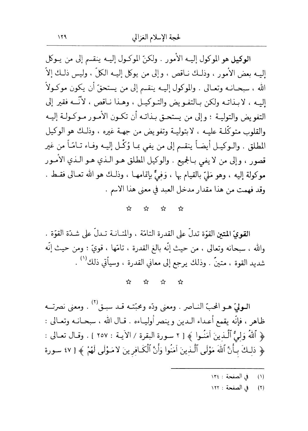 هُوَ الموكول إِلَيْهِ الْأُمُور وَلَكِن الموكول إِلَيْهِ يَنْقَسِم إِلَى من يُوكل إِلَيْهِ بعض الْأُمُور وَذَلِكَ نَاقص وَإِلَى من يُوكل إِلَيْهِ الْكل وَلَيْسَ ذَلِك إِلَّا الله سُبْحَانَهُ وَتَعَالَى والموكول إِلَيْهِ يَنْقَسِم إِلَى من يسْتَحق أَن يكون موكولا إِلَيْهِ لَا بِذَاتِهِ وَلَكِن بالتفويض وَالتَّوْكِيل وَهَذَا نَاقص لِأَنَّهُ فَقير إِلَى التَّفْوِيض وَالتَّوْلِيَة وَإِلَى من يسْتَحق بِذَاتِهِ أَن تكون الْأُمُور موكولة إِلَيْهِ والقلوب متوكلة عَلَيْهِ لَا بتولية وتفويض من جِهَة غَيره وَذَلِكَ هُوَ الْوَكِيل الْمُطلق وَالْوَكِيل أَيْضا يَنْقَسِم إِلَى من يَفِي بِمَا وكل إِلَيْهِ وَفَاء تَاما من غير قُصُور وَإِلَى من لَا يَفِي بِالْجَمِيعِ وَالْوَكِيل الْمُطلق هُوَ الَّذِي الْأُمُور موكولة إِلَيْهِ وَهُوَ ملي بِالْقيامِ بهَا وَفِي بإتمامها وَذَلِكَ هُوَ الله تَعَالَى فَقَط وَقد فهمت من هَذَا مِقْدَار مدْخل العَبْد فِي معنى هَذَا الِاسْم