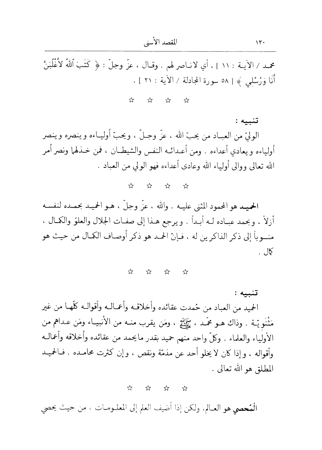 هُوَ الْمَحْمُود الْمثنى عَلَيْهِ وَالله عز وَجل هُوَ الحميد بِحَمْدِهِ لنَفسِهِ أزلا وبحمد عباده لَهُ أبدا وَيرجع هَذَا إِلَى صِفَات الْجلَال والعلو والكمال مَنْسُوبا إِلَى ذكر الذَّاكِرِينَ لَهُ فَإِن الْحَمد هُوَ ذكر أَوْصَاف الْكَمَال من حَيْثُ هُوَ كَمَال تَنْبِيه