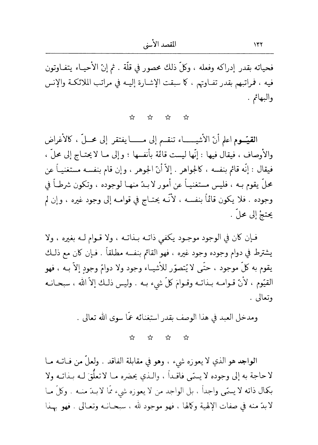 فَإِن كَانَ فِي الْوُجُود مَوْجُود يَكْفِي ذَاته بِذَاتِهِ وَلَا قوام لَهُ بِغَيْرِهِ وَلَا يشْتَرط فِي دوَام وجوده وجود غَيره فَهُوَ الْقَائِم بِنَفسِهِ مُطلقًا فَإِن كَانَ مَعَ ذَلِك يقوم بِهِ كل مَوْجُود حَتَّى لَا يتَصَوَّر للأشياء وجود وَلَا دوَام وجود إِلَّا بِهِ فَهُوَ القيوم لِأَن قوامه بِذَاتِهِ وقوام كل شَيْء بِهِ وَلَيْسَ ذَلِك إِلَّا الله سُبْحَانَهُ وَتَعَالَى