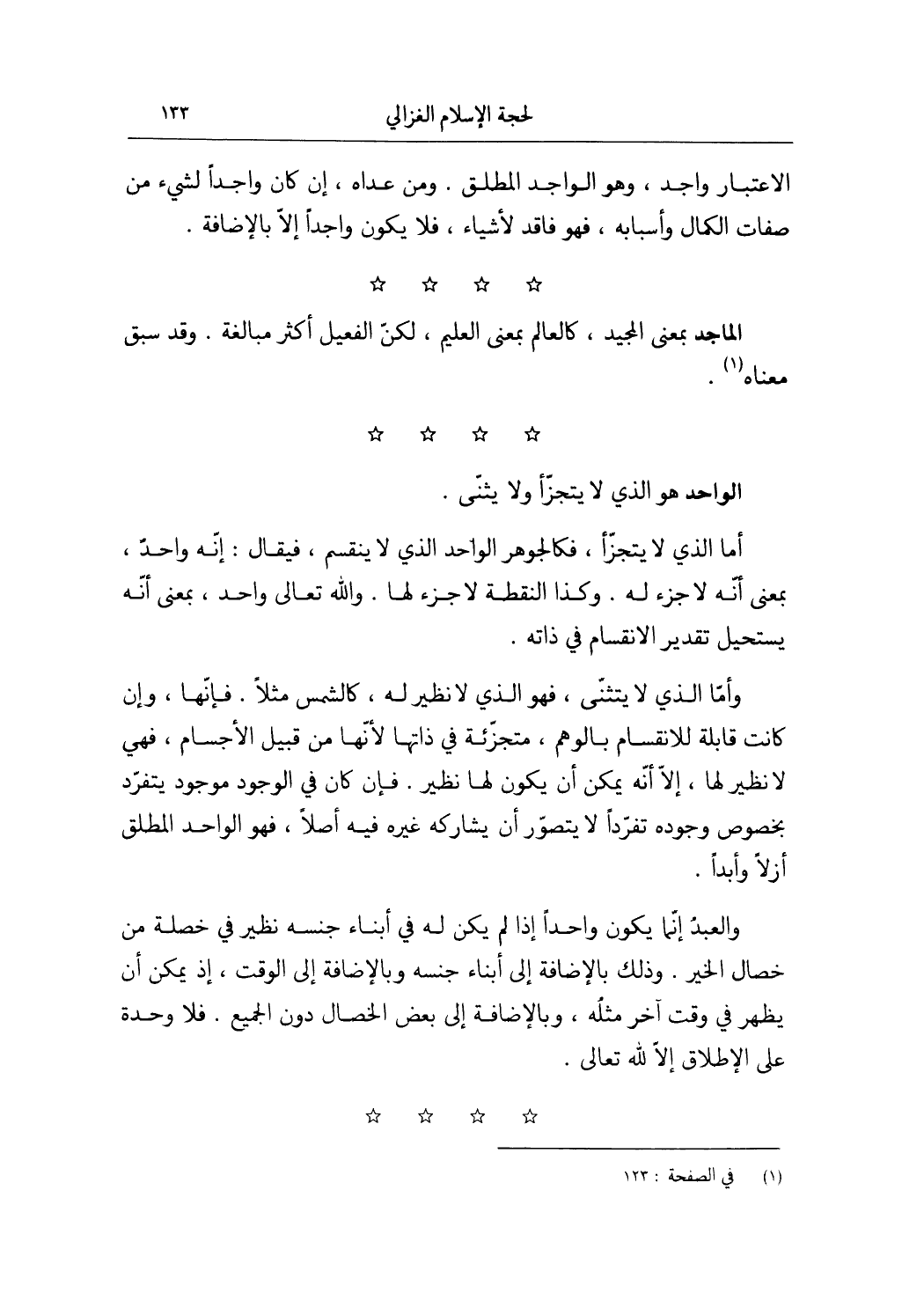 وَأما الَّذِي لَا يتثنى فَهُوَ الَّذِي لَا نَظِير لَهُ كَالشَّمْسِ مثلا فَإِنَّهَا وَإِن كَانَت قَابِلَة للانقسام بالوهم متجزئة فِي ذَاتهَا لِأَنَّهَا من قبيل الْأَجْسَام فَهِيَ لَا نَظِير لَهَا إِلَّا أَنه يُمكن أَن يكون لَهَا نَظِير فَإِن كَانَ فِي الْوُجُود مَوْجُود يتفرد بِخُصُوص وجوده تفردا لَا يتَصَوَّر أَن يُشَارِكهُ غَيره فِيهِ أصلا فَهُوَ الْوَاحِد الْمُطلق أزلا وأبدا