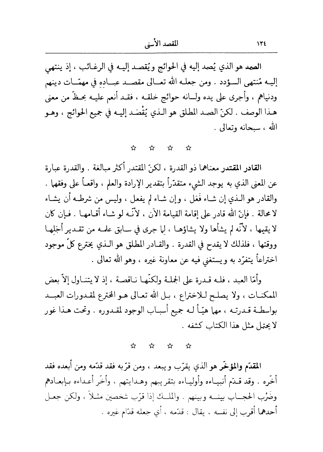 هُوَ الَّذِي يصمد إِلَيْهِ فِي الْحَوَائِج ويقصد إِلَيْهِ فِي الرغائب إِذْ يَنْتَهِي إِلَيْهِ مُنْتَهى السؤدد وَمن جعله الله تَعَالَى مقصد عباده فِي مهمات دينهم ودنياهم وأجرى على يَده وَلسَانه حوائج خلقه فقد أنعم عَلَيْهِ بحظ من معنى هَذَا الْوَصْف لَكِن الصَّمد الْمُطلق هُوَ الَّذِي يقْصد إِلَيْهِ فِي جَمِيع الْحَوَائِج وَهُوَ الله سُبْحَانَهُ وَتَعَالَى