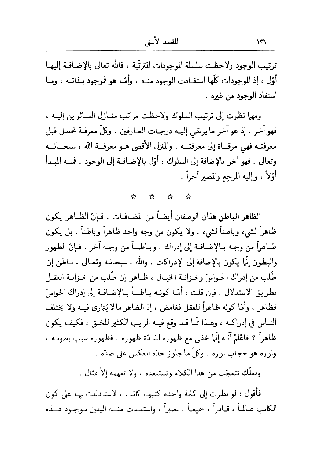 وَمهما نظرت إِلَى تَرْتِيب السلوك ولاحظت مَرَاتِب منَازِل السائرين إِلَيْهِ فَهُوَ آخر إِذْ هُوَ آخر مَا يرتقي إِلَيْهِ دَرَجَات العارفين وكل معرفَة تحصل قبل مَعْرفَته فَهِيَ مرقاة إِلَى مَعْرفَته والمنزل الْأَقْصَى هُوَ معرفَة الله سُبْحَانَهُ وَتَعَالَى فَهُوَ آخر بِالْإِضَافَة إِلَى السلوك أول بِالْإِضَافَة إِلَى الْوُجُود فَمِنْهُ المبدأ أَولا وَإِلَيْهِ الْمرجع والمصير آخرا