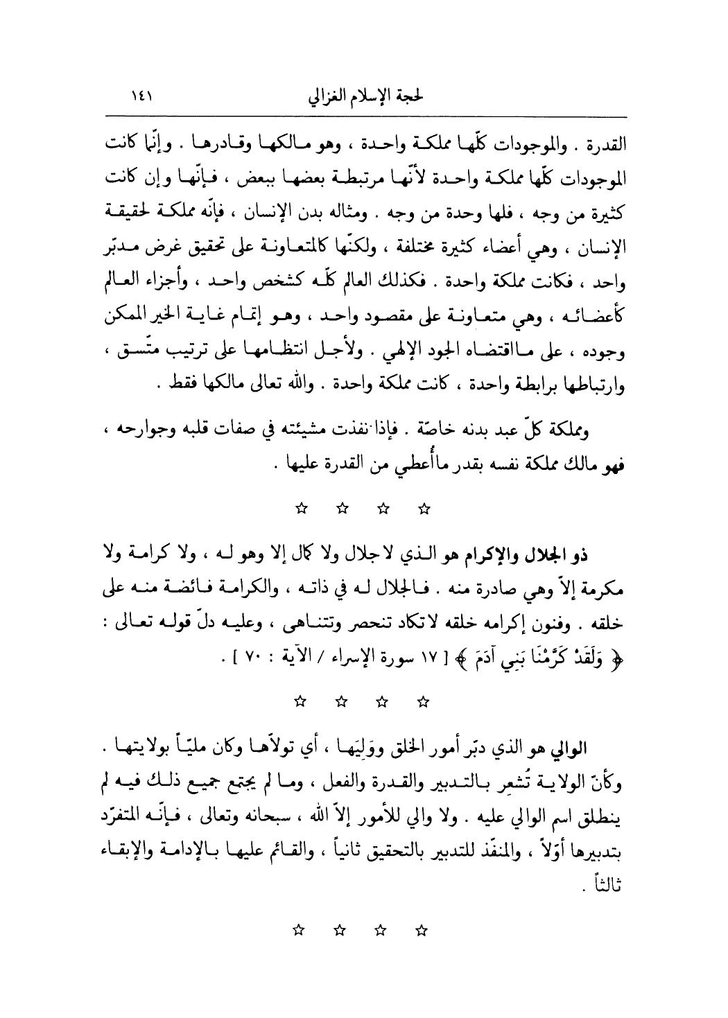 الْقُدْرَة والموجودات كلهَا مملكة وَاحِدَة وَهُوَ مَالِكهَا وقادرها وَإِنَّمَا كَانَت الموجودات كلهَا مملكة وَاحِدَة لِأَنَّهَا مرتبطة بَعْضهَا بِبَعْض فَإِنَّهَا وَإِن كَانَت كَثِيرَة من وَجه فلهَا وحدة من وَجه ومثاله بدن الْإِنْسَان فَإِنَّهُ مملكة لحقيقة الْإِنْسَان وَهِي أَعْضَاء كَثِيرَة مُخْتَلفَة وَلكنهَا كالمتعاونة على تَحْقِيق غَرَض مُدبر وَاحِد فَكَانَت مملكة وَاحِدَة فَكَذَلِك الْعَالم كُله كشخص وَاحِد وأجزاء الْعَالم كأعضائه وَهِي متعاونة على مَقْصُود وَاحِد وَهُوَ إتْمَام غَايَة الْخَيْر الْمُمكن وجوده على مَا اقْتَضَاهُ الْجُود الإلهي وَلأَجل انتظامها على تَرْتِيب متسق وارتباطها برابطة وَاحِدَة كَانَت مملكة وَاحِدَة وَالله تَعَالَى مَالِكهَا فَقَط
