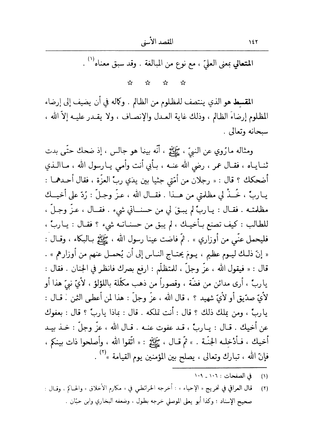 ومثاله مَا رُوِيَ عَن النَّبِي صلى الله عَلَيْهِ وَسلم أَنه بَيْنَمَا هُوَ جَالس إِذْ ضحك حَتَّى بَدَت ثناياه فَقَالَ عمر رَضِي الله عَنهُ بِأبي أَنْت وَأمي يَا رَسُول الله مَا الَّذِي أضْحكك قَالَ رجلَانِ من أمتِي جثيا بَين يَدي رب الْعِزَّة فَقَالَ أَحدهمَا يَا رب خُذ لي مظلمتي من هَذَا فَقَالَ الله عز وَجل رد على أَخِيك مظلمته فَقَالَ يَا رب لم يبْق لي من حسناتي شَيْء فَقَالَ عز وَجل للطَّالِب كَيفَ تصنع بأخيك لم يبْق من حَسَنَاته شَيْء فَقَالَ يَا رب فليحمل عني من أوزاري ثمَّ فاضت عينا رَسُول الله صلى الله عَلَيْهِ وَسلم بالبكاء وَقَالَ إِن ذَلِك ليَوْم عَظِيم يَوْم يحْتَاج النَّاس إِلَى أَن يحمل عَنْهُم من أوزارهم قَالَ فَيَقُول الله عز وَجل للمتظلم ارْفَعْ بَصرك فَانْظُر فِي الْجنان فَقَالَ يَا رب أرى مَدَائِن من فضَّة وقصورا من ذهب مكللة بِاللُّؤْلُؤِ لأي نَبِي هَذَا أَو لأي صديق أَو لأي شَهِيد قَالَ الله عز وَجل هَذَا لمن أعْطى الثّمن قَالَ يَا رب وَمن يملك ذَلِك قَالَ أَنْت تملكه قَالَ بِمَاذَا يَا رب قَالَ بعفوك عَن أَخِيك قَالَ يَا رب قد عَفَوْت عَنهُ قَالَ الله عز وَجل خُذ بيد أَخِيك فَأدْخلهُ الْجنَّة ثمَّ قَالَ صلى الله عَلَيْهِ وَسلم اتَّقوا الله وَأَصْلحُوا ذَات بَيْنكُم فَإِن الله تبَارك وَتَعَالَى يصلح بَين الْمُؤمنِينَ يَوْم الْقِيَامَة
