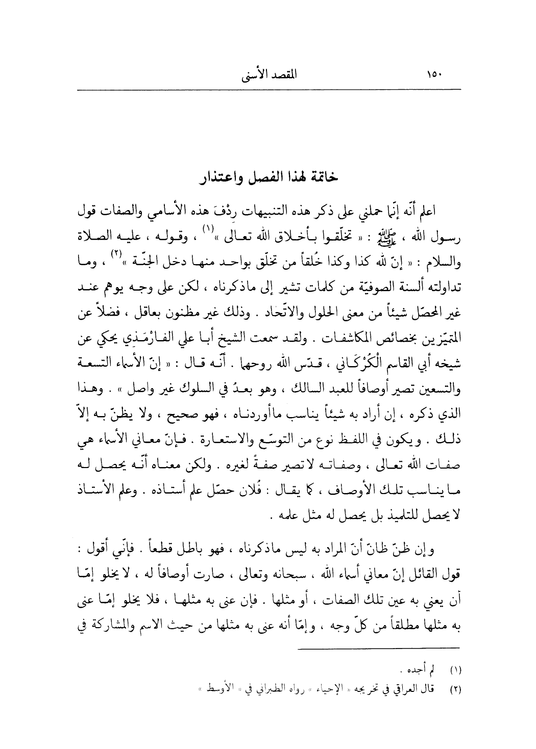 اعْلَم أَنه إِنَّمَا حَملَنِي على ذكر هَذِه التَّنْبِيهَات ردف هَذِه الْأَسَامِي وَالصِّفَات قَول رَسُول الله صلى الله عَلَيْهِ وَسلم تخلقوا بأخلاق الله تَعَالَى وَقَوله عَلَيْهِ الصَّلَاة وَالسَّلَام إِن لله كَذَا وَكَذَا خلقا من تخلق بِوَاحِد مِنْهَا دخل الْجنَّة وَمَا تداولته أَلْسِنَة الصُّوفِيَّة من كَلِمَات تُشِير إِلَى مَا ذَكرْنَاهُ لَكِن على وَجه يُوهم عِنْد غير المحصل شَيْئا من معنى الْحُلُول والاتحاد وَذَلِكَ غير مظنون بعاقل فضلا عَن المتميزين بخصائص المكاشفات وَلَقَد سَمِعت الشَّيْخ أَبَا عَليّ الفارمذي يَحْكِي عَن شَيْخه أبي الْقَاسِم الكركاني قدس الله روحهما أَنه قَالَ إِن الْأَسْمَاء التِّسْعَة وَالتسْعين تصير أوصافا للْعَبد السالك وَهُوَ بعد فِي السلوك غير وَاصل وَهَذَا الَّذِي ذكره إِن أَرَادَ بِهِ شَيْئا يُنَاسب مَا أوردناه فَهُوَ صَحِيح وَلَا يظنّ بِهِ إِلَّا ذَلِك وَيكون فِي اللَّفْظ نوع من التَّوَسُّع والاستعارة فَإِن مَعَاني الْأَسْمَاء هِيَ صِفَات الله تَعَالَى وَصِفَاته لَا تصير صفة لغيره وَلَكِن مَعْنَاهُ أَنه يحصل لَهُ مَا يُنَاسب تِلْكَ الْأَوْصَاف كَمَا يُقَال فلَان حصل علم أستاذه وَعلم الْأُسْتَاذ لَا يحصل للتلميذ بل يحصل لَهُ مثل علمه