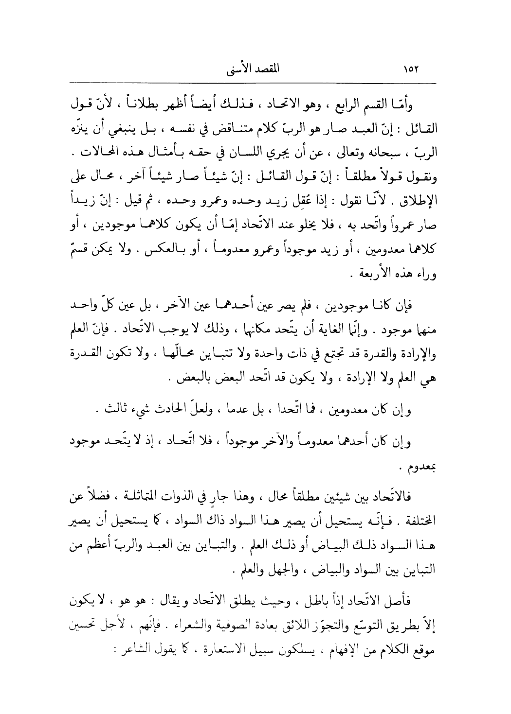 وَأما الْقسم الرَّابِع وَهُوَ الِاتِّحَاد فَذَلِك أَيْضا أظهر بطلانا لِأَن قَول الْقَائِل إِن العَبْد صَار هُوَ الرب كَلَام متناقض فِي نَفسه بل يَنْبَغِي أَن ينزه الرب سُبْحَانَهُ وَتَعَالَى عَن أَن يجْرِي اللِّسَان فِي حَقه بأمثال هَذِه المحالات ونقول قولا مُطلقًا إِن قَول الْقَائِل إِن شَيْئا صَار شَيْئا آخر محَال على الْإِطْلَاق لأَنا نقُول إِذا عقل زيد وَحده وَعَمْرو وَحده ثمَّ قيل إِن زيدا صَار عمروا واتحد بِهِ فَلَا يَخْلُو عِنْد الِاتِّحَاد إِمَّا أَن يكون كِلَاهُمَا موجودين أَو كِلَاهُمَا معدومين أَو زيد مَوْجُودا وَعَمْرو مَعْدُوما أَو بِالْعَكْسِ وَلَا يُمكن قسم وَرَاء هَذِه الْأَرْبَعَة