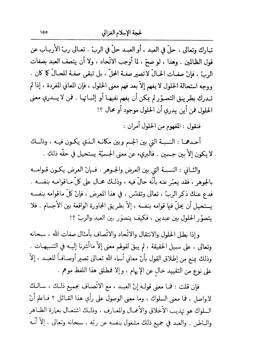 تبَارك وَتَعَالَى حل فِي العَبْد أَو العَبْد حل فِي الرب تَعَالَى رب الأرباب عَن قَول الظَّالِمين وَهَذَا لَو صَحَّ لما أوجب الِاتِّحَاد وَلَا أَن يَتَّصِف العَبْد بِصِفَات الرب فَإِن صِفَات الْحَال لَا تصير صفة الْمحل بل تبقى صفة للْحَال كَمَا كَانَ وَوجه اسْتِحَالَة الْحُلُول لَا يفهم إِلَّا بعد فهم معنى الْحُلُول فَإِن الْمعَانِي المفردة إِذا لم تدْرك بطرِيق التَّصَوُّر لم يُمكن أَن يفهم نَفيهَا أَو إِثْبَاتهَا فَمن لَا يدْرِي معنى الْحُلُول فَمن أَيْن يدْرِي أَن الْحُلُول مَوْجُود أَو محَال