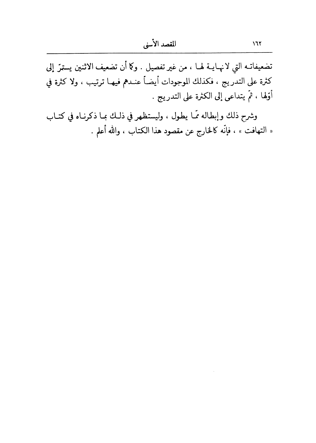 تضعيفاته الَّتِي لَا نِهَايَة لَهَا من غير تَفْصِيل وكما أَن تَضْعِيف الِاثْنَيْنِ يسْتَمر إِلَى كَثْرَة على التدريج فَكَذَلِك الموجودات أَيْضا عِنْدهم فِيهَا تَرْتِيب وَلَا كَثْرَة فِي أَولهَا ثمَّ يتداعى إِلَى الْكَثْرَة على التدريج