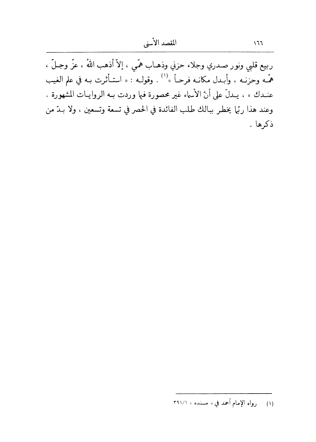 ربيع قلبِي وَنور صَدْرِي وجلاء حزني وَذَهَاب همي إِلَّا أذهب الله عز وَجل همه وحزنه وأبدل مَكَانَهُ فَرحا وَقَوله استأثرت بِهِ فِي علم الْغَيْب عنْدك يدل على أَن الْأَسْمَاء غير محصورة فِيمَا وَردت بِهِ الرِّوَايَات الْمَشْهُورَة وَعند هَذَا رُبمَا يخْطر ببالك طلب الْفَائِدَة فِي الْحصْر فِي تِسْعَة وَتِسْعين وَلَا بُد من ذكرهَا